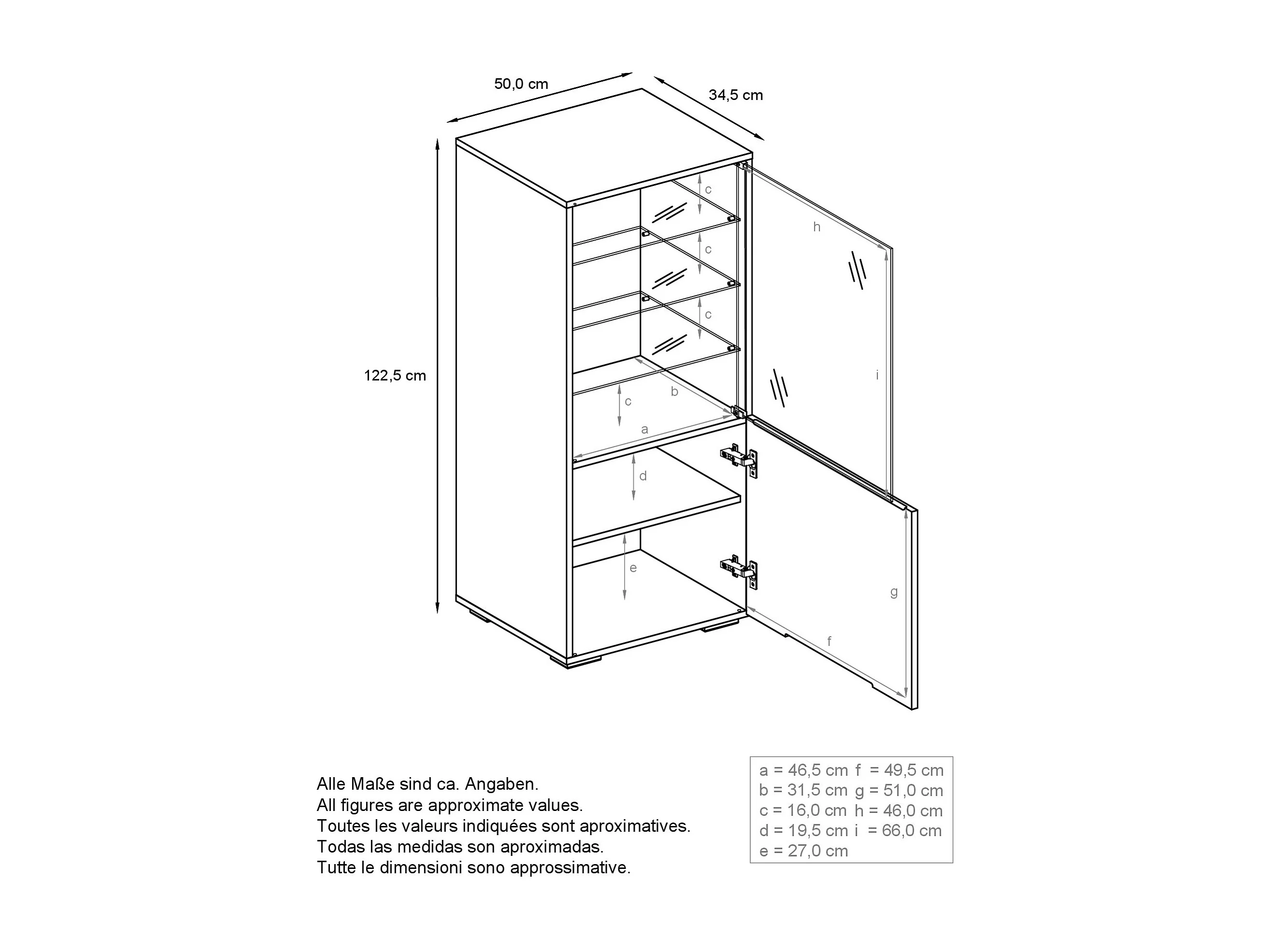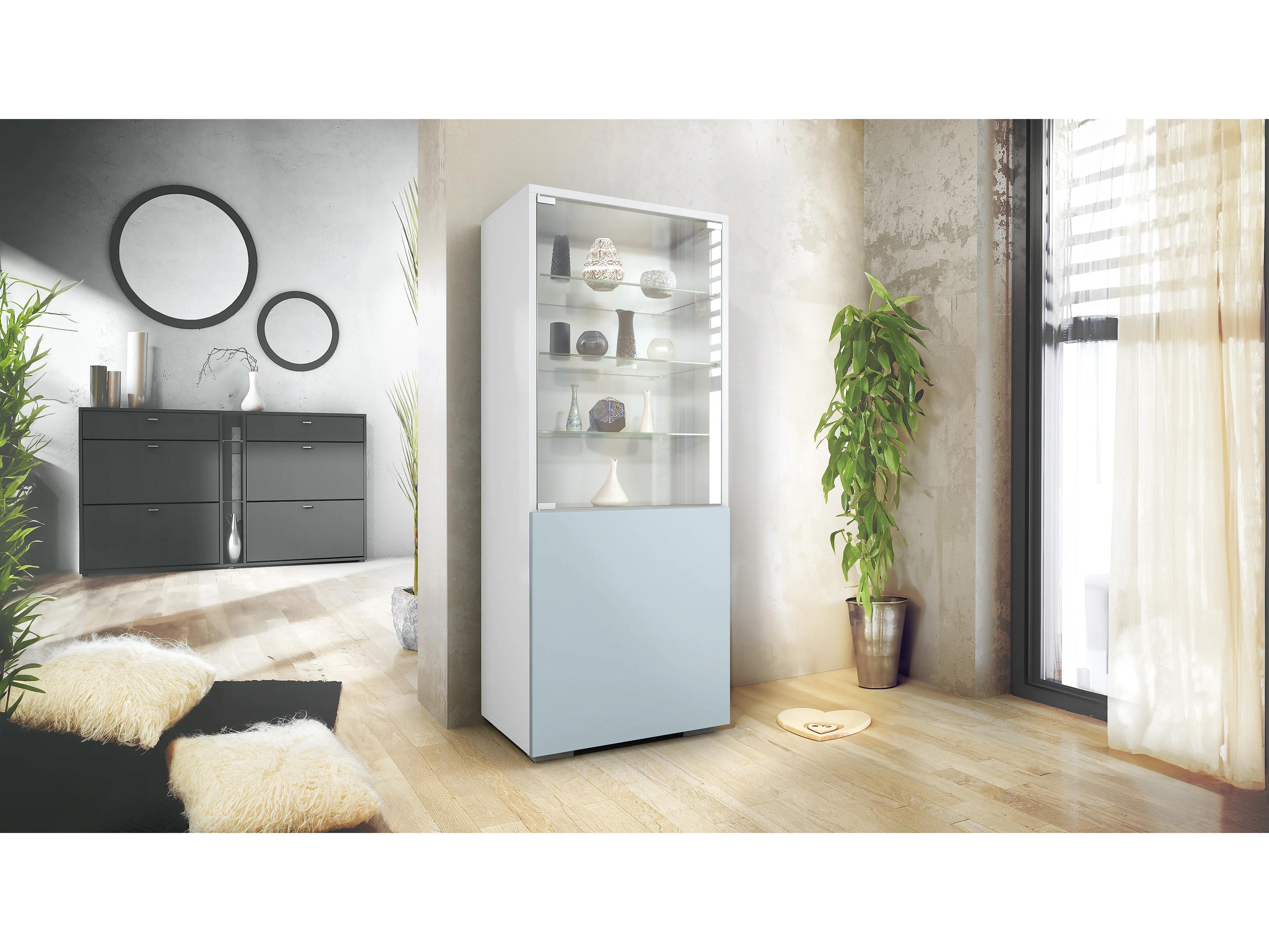 Vitrine Granada, Armoire Vitrée Made in Germany, avec Porte en Verre et Insert en Verre, blanc mat/denim mat (50 x 122,5 x 34,5 cm)