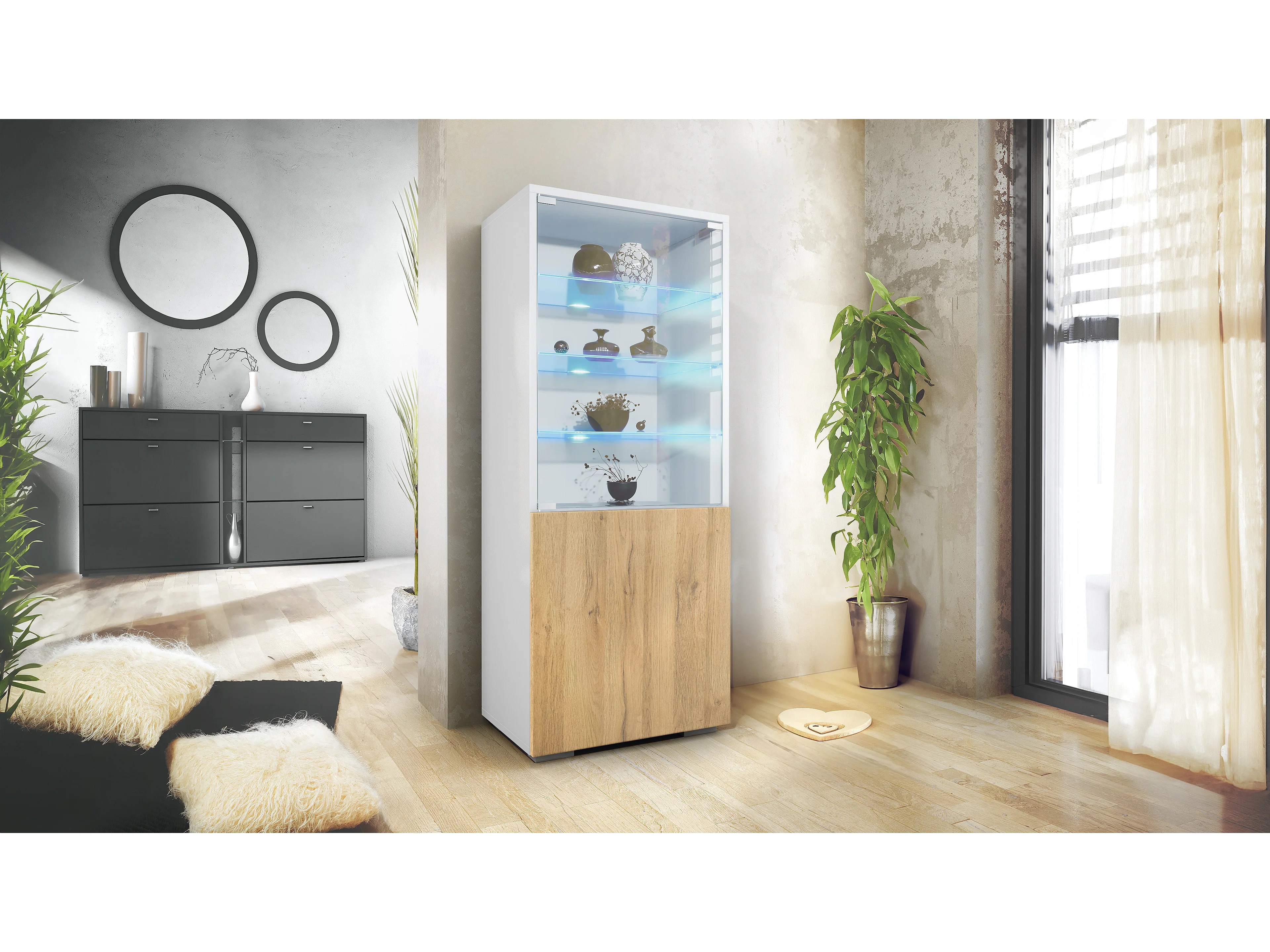 Vitrine Granada de , Armoire Vitrée Made in Germany avec Porte en Verre et Insert en Verre y compris LED, blanc mat/chêne nature (50 x 122,5 x 34,5 cm)