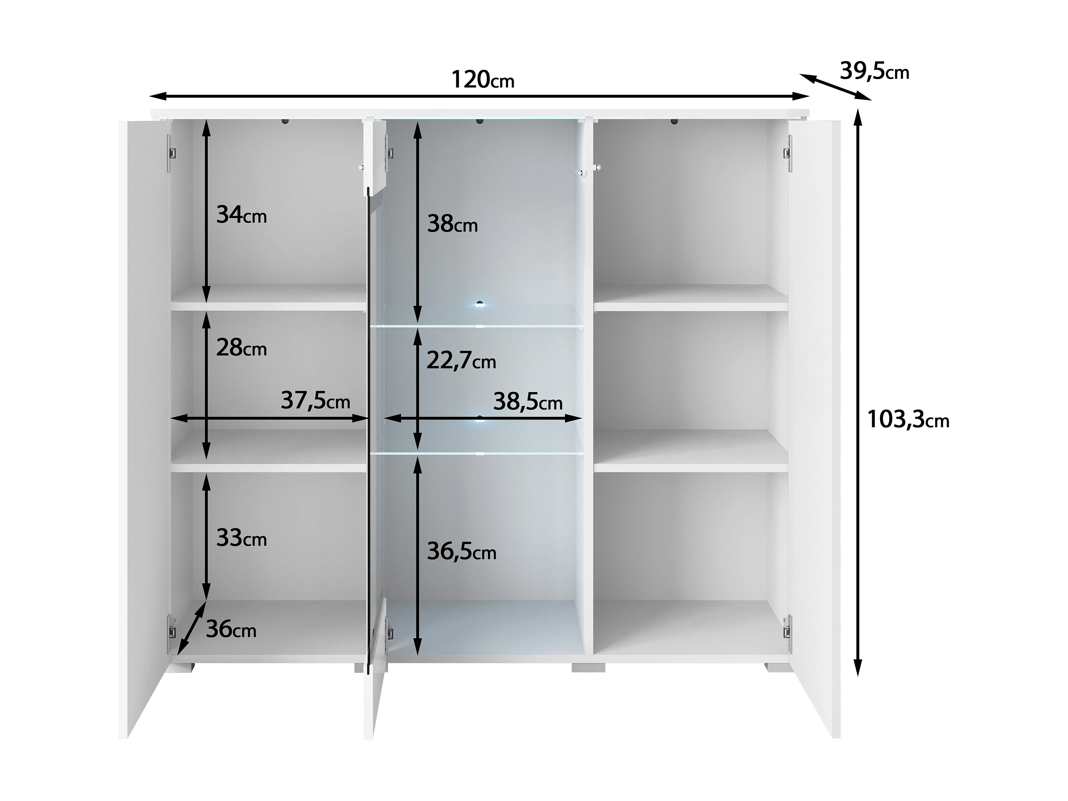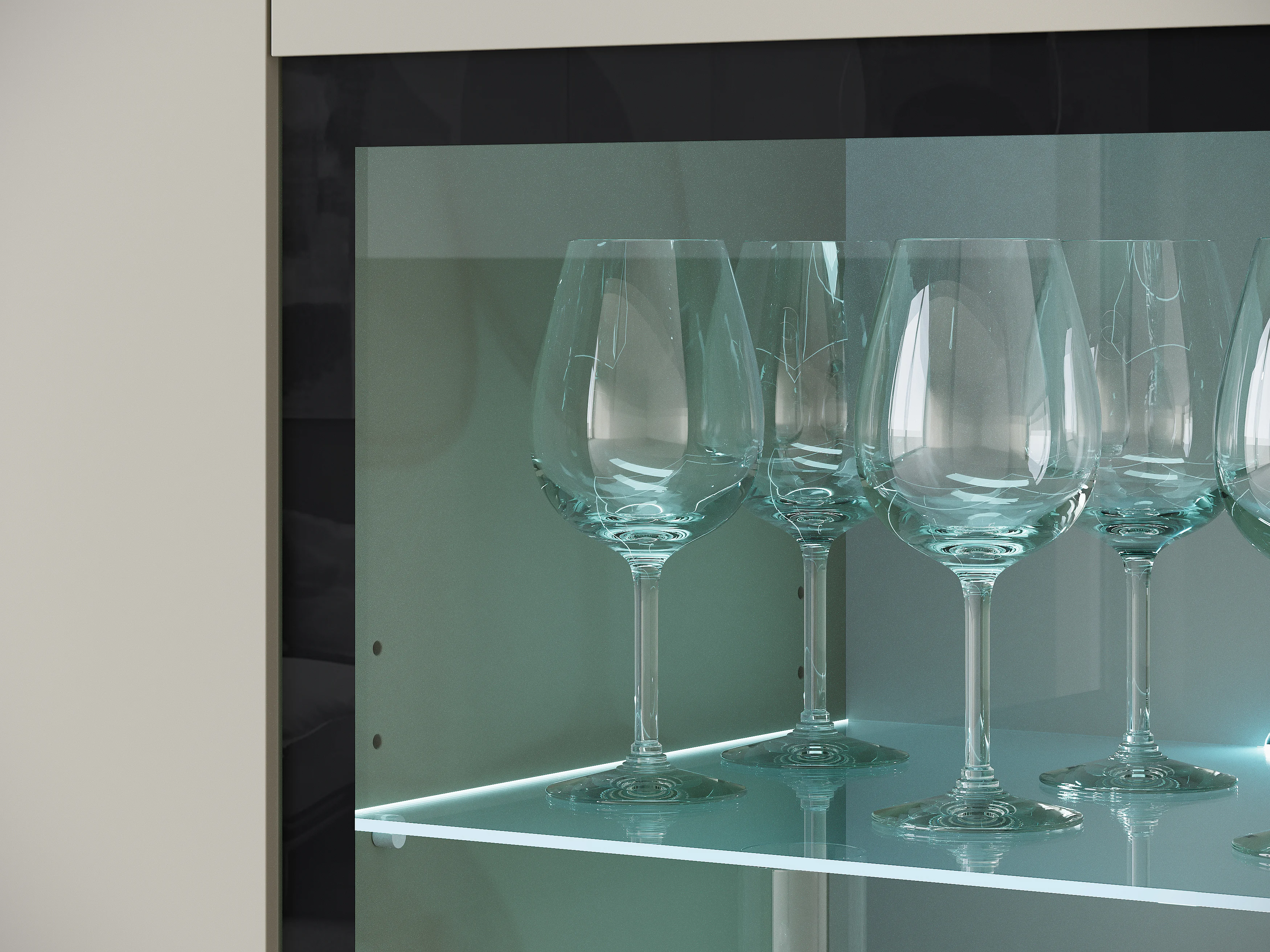 Vitrine haute moderne 120 cm pour salon avec LED, 3 portes, beige cachemire mat