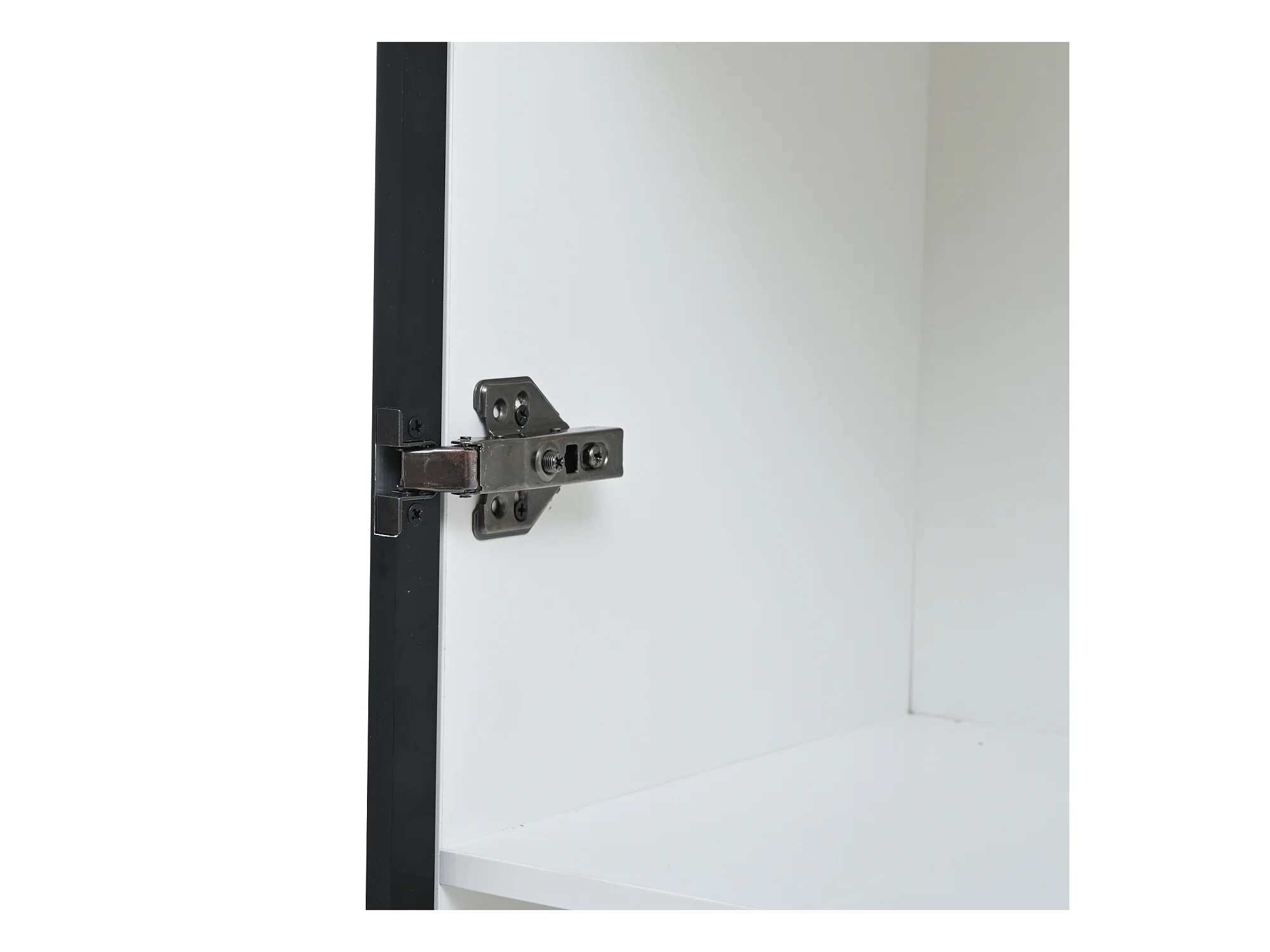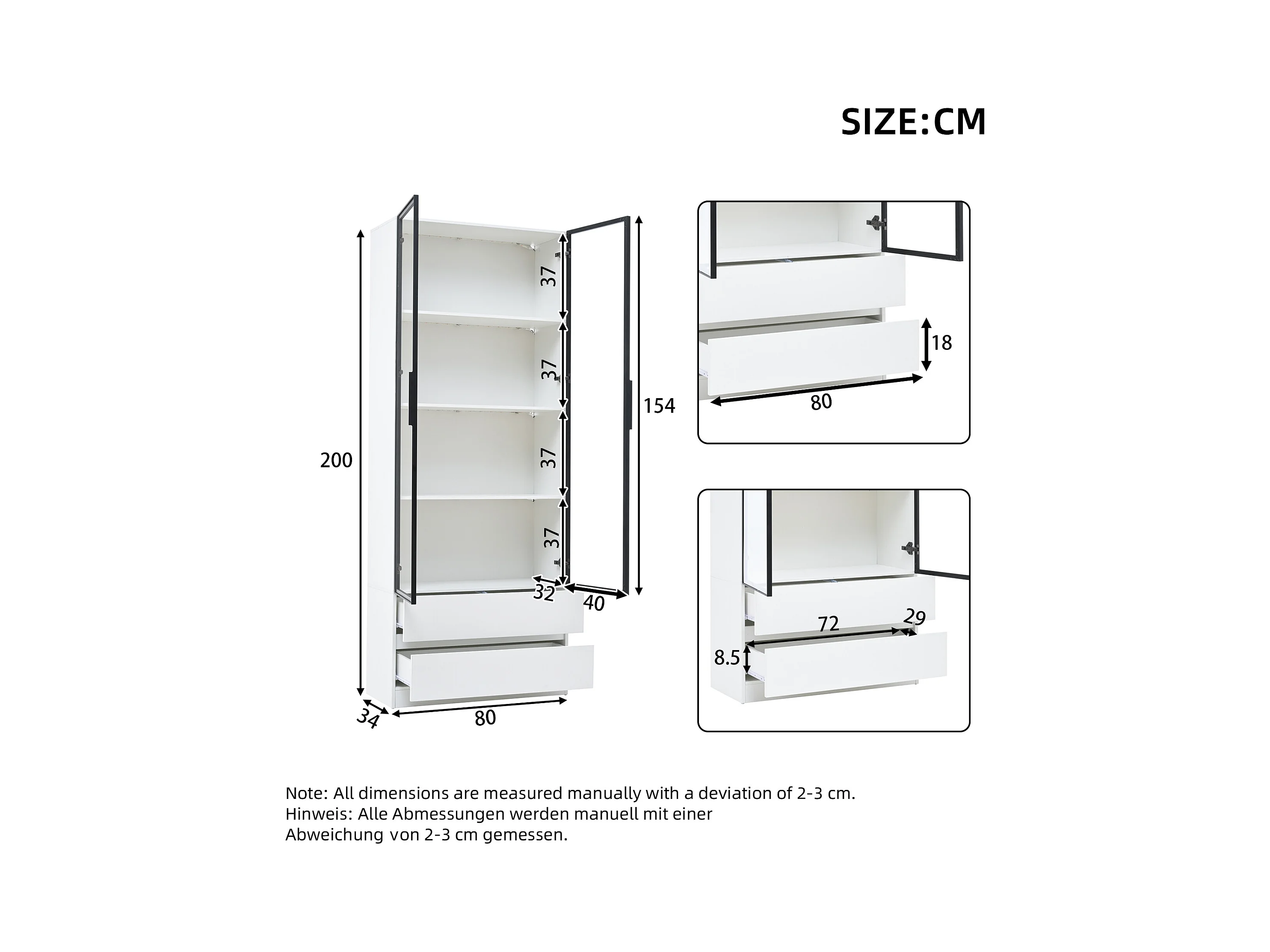 Vitrine LED avec 2 portes vitrées et 2 tiroirs de rangement, blanche - pour salon et bureau