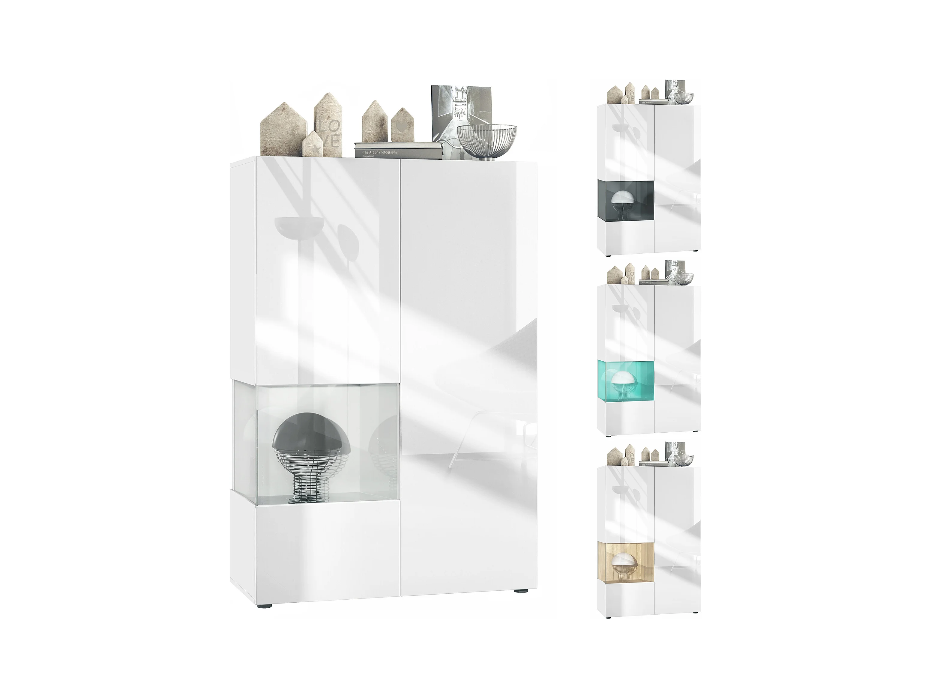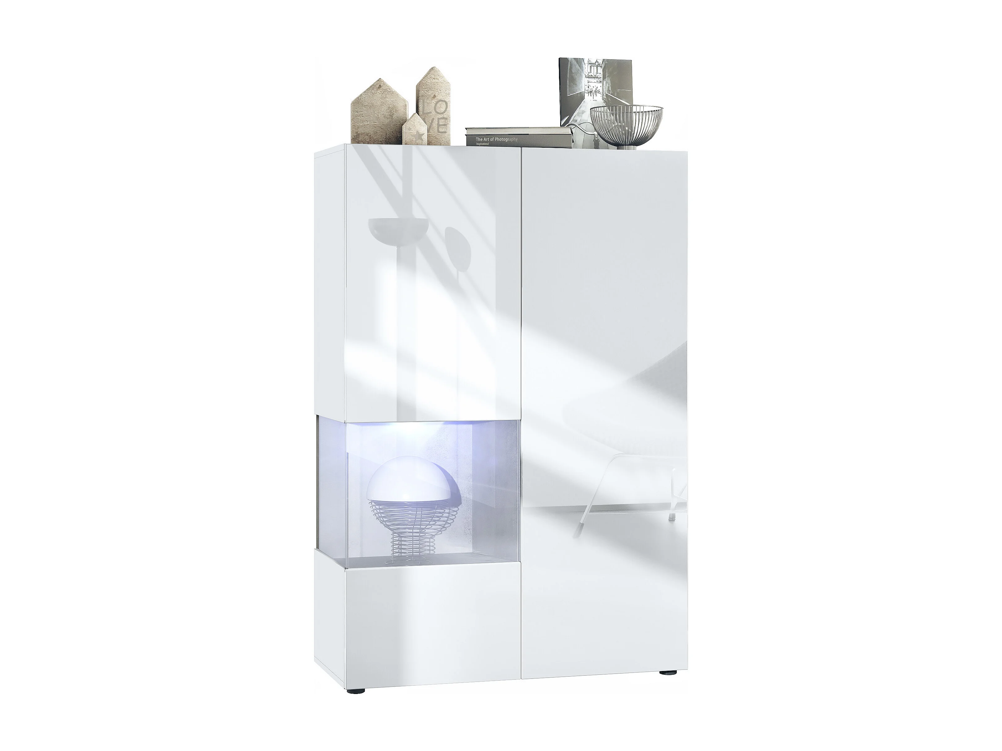 Vitrine Morena V2, vitrine sur pied avec 2 portes et insert en verre, corps blanc mat, façades Blanc brillant, Cube aspect béton oxyde avec LED blanc
