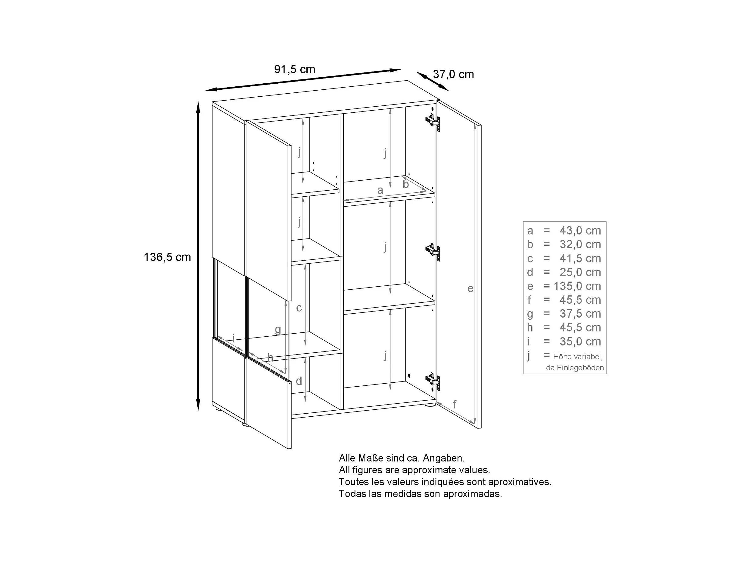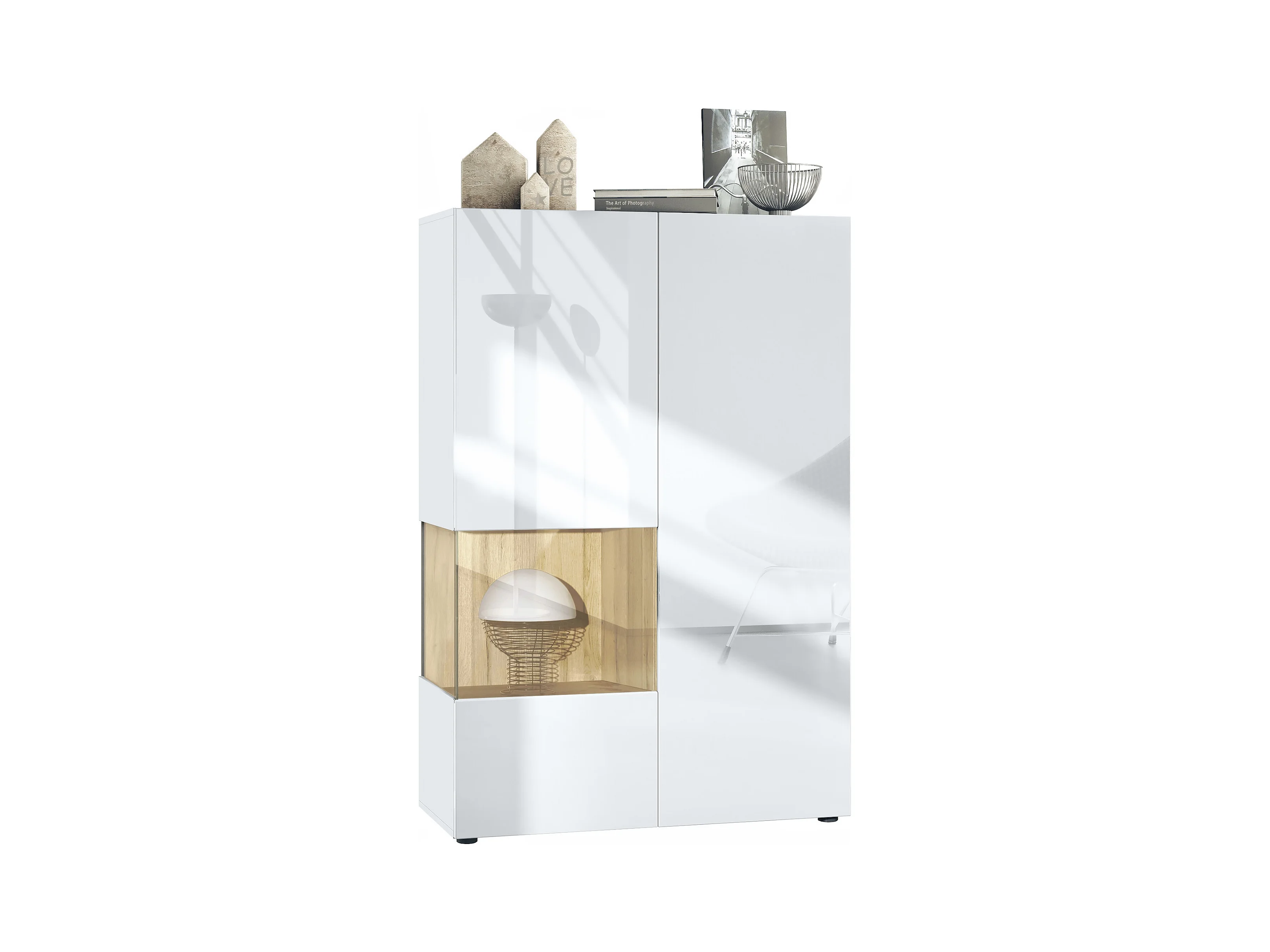 Vitrine Morena V2, vitrine sur pied avec 2 portes et insert en verre, corps blanc mat, façades blanc haute brillance, Cube chêne nature