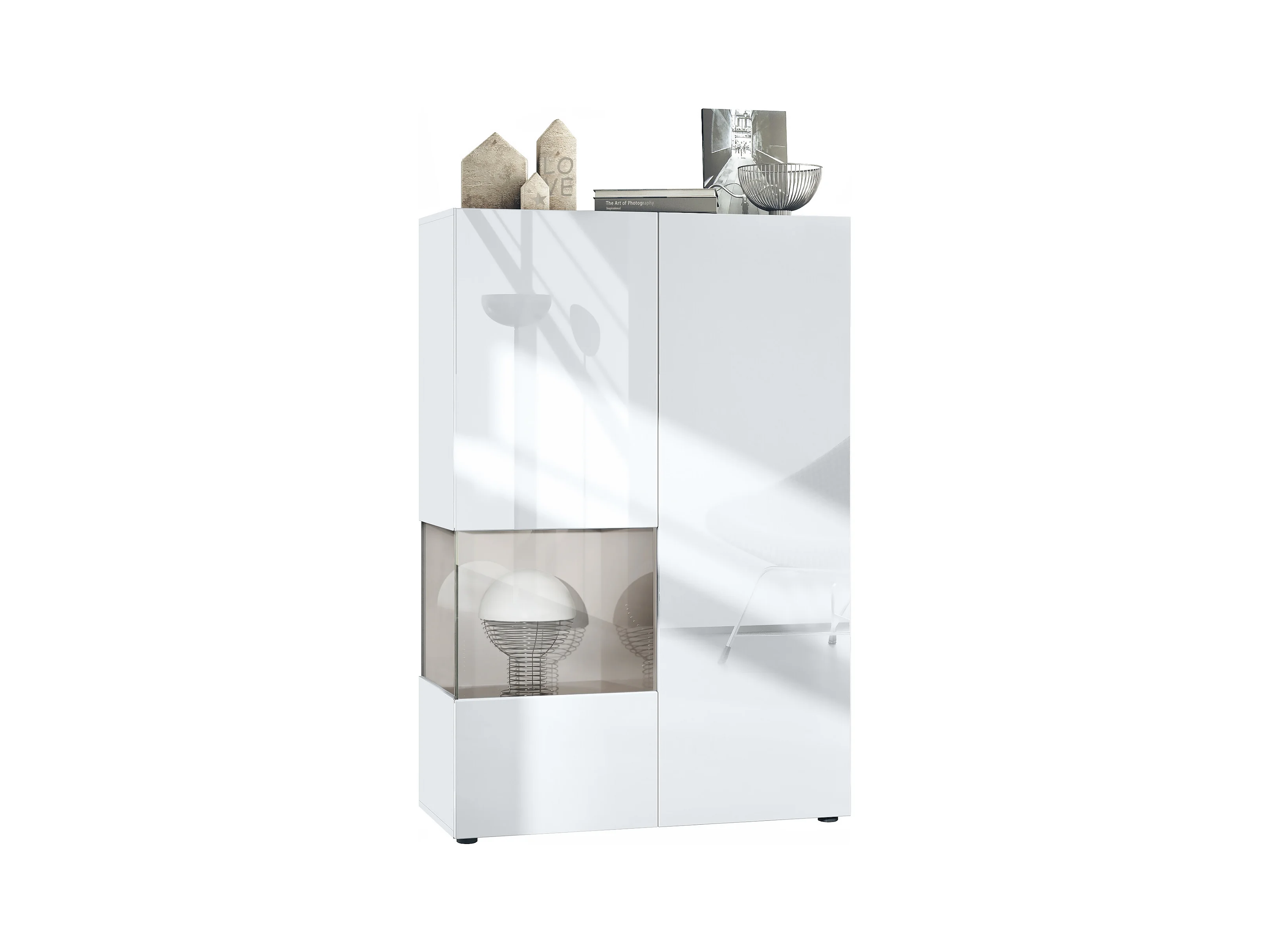 Vitrine Morena V2, vitrine sur pied avec 2 portes et insert en verre, corps blanc mat, façades blanc haute brillance, Cube gris sable haute brillance