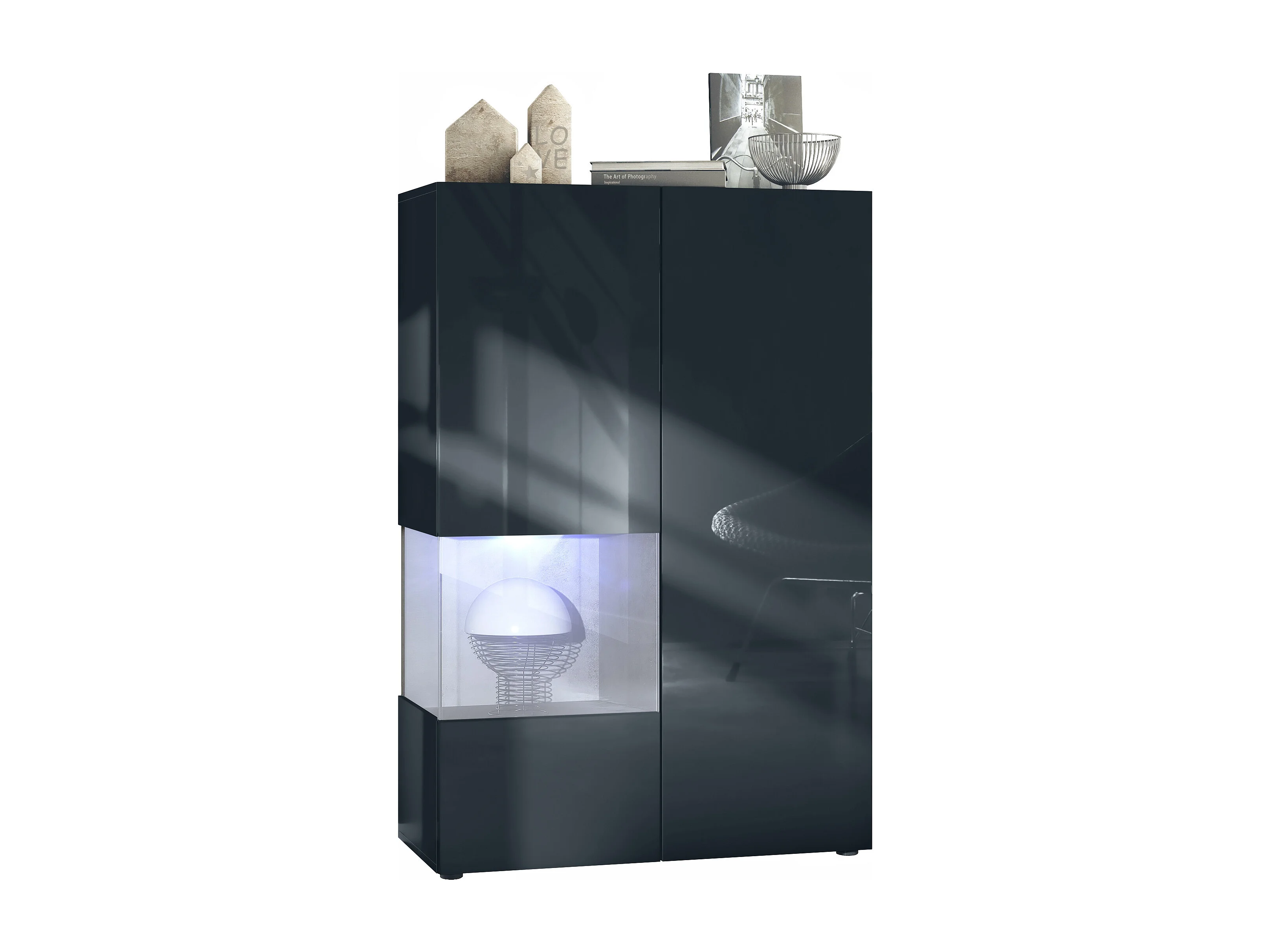Vitrine Morena V2, vitrine sur pied avec 2 portes et insert en verre, corps noir mat, façades noir brillant, Cube aspect béton oxyde avec éclairage LED blanc
