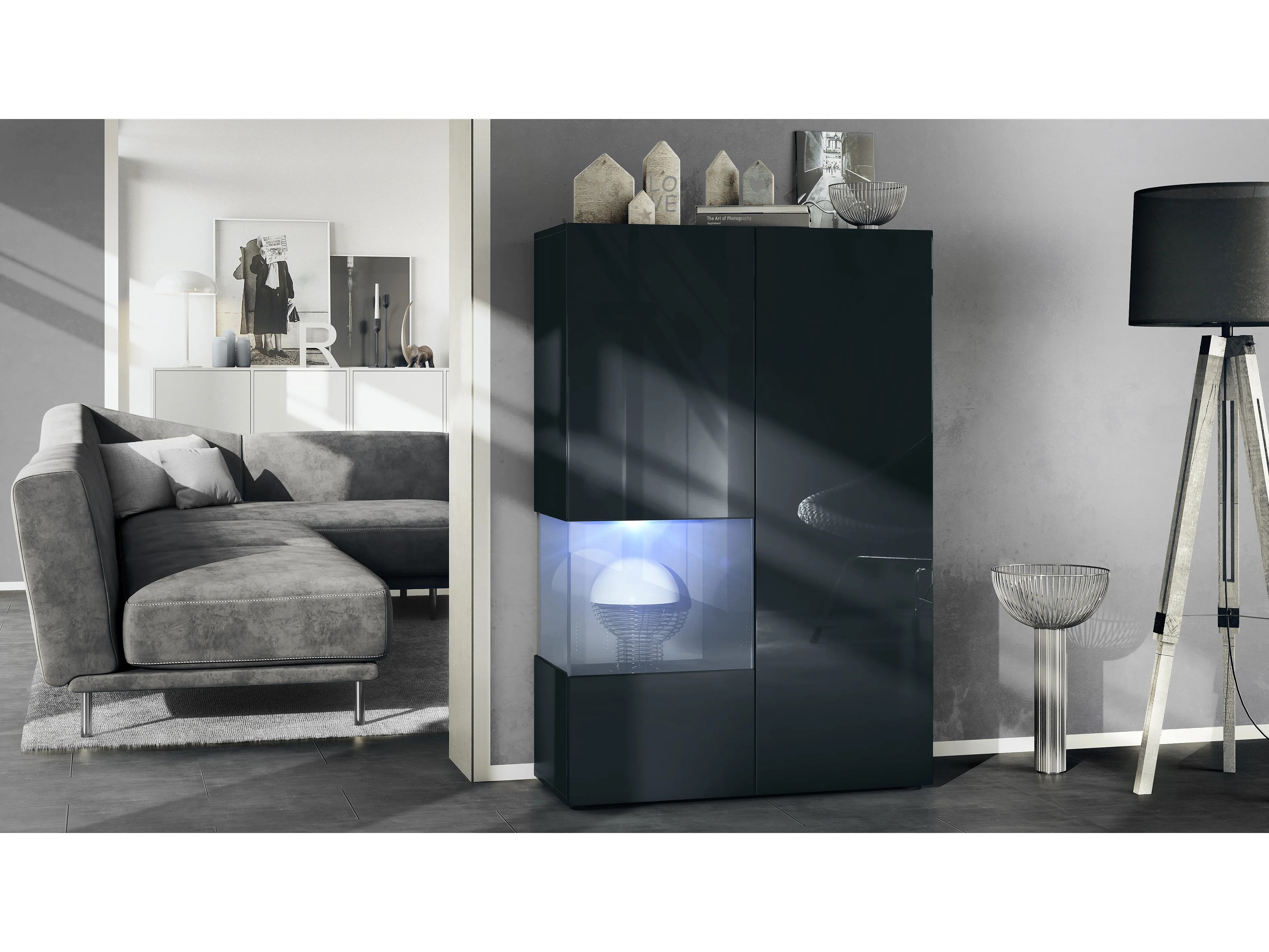 Vitrine Morena V2, vitrine sur pied avec 2 portes et insert en verre, corps noir mat, façades noir brillant, Cube gris brillant avec éclairage LED blanc