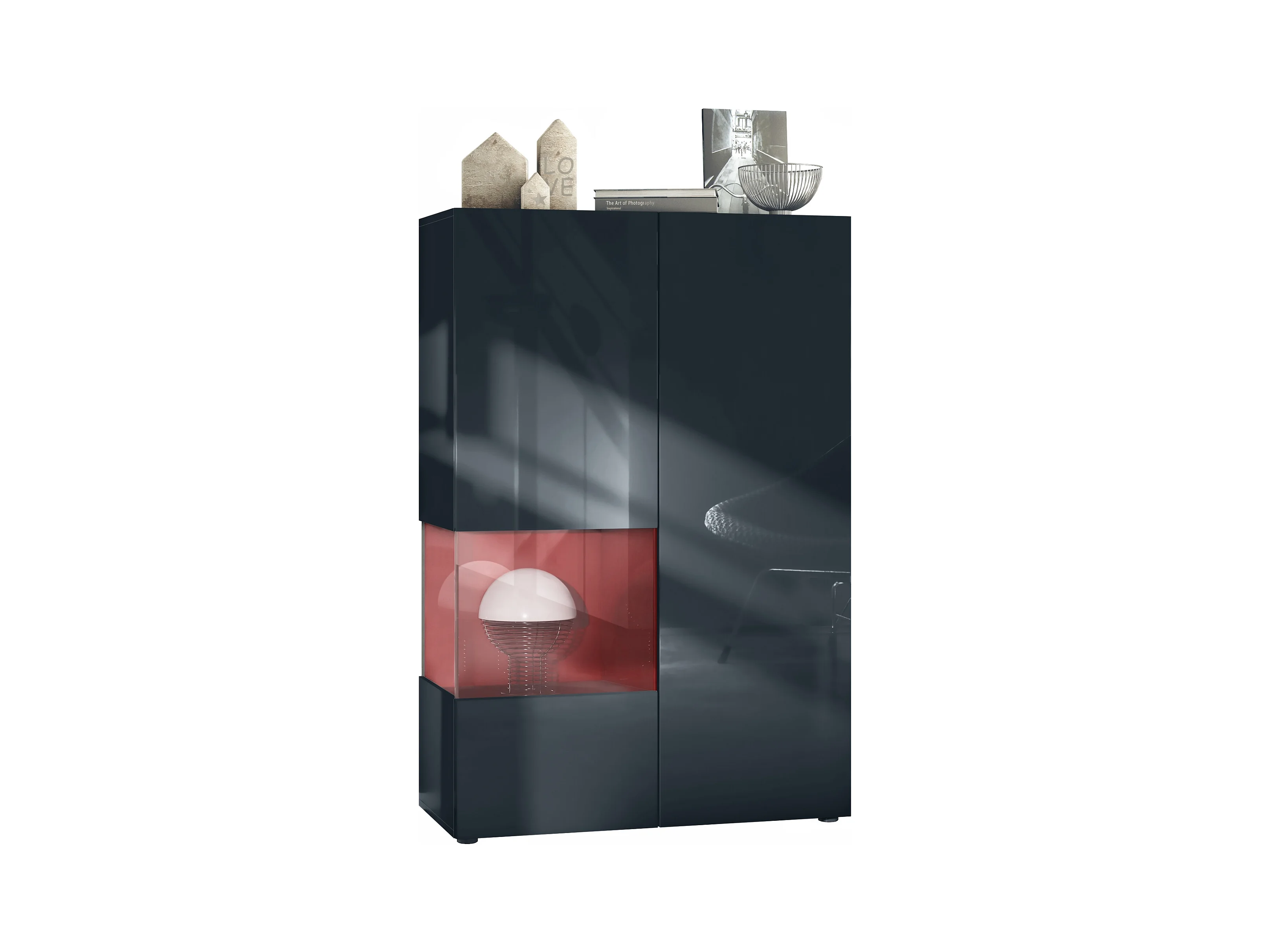 Vitrine Morena V2, vitrine sur pied avec 2 portes et insert en verre, corps noir mat, façades noir haute brillance, Cube bordeaux haute brillance