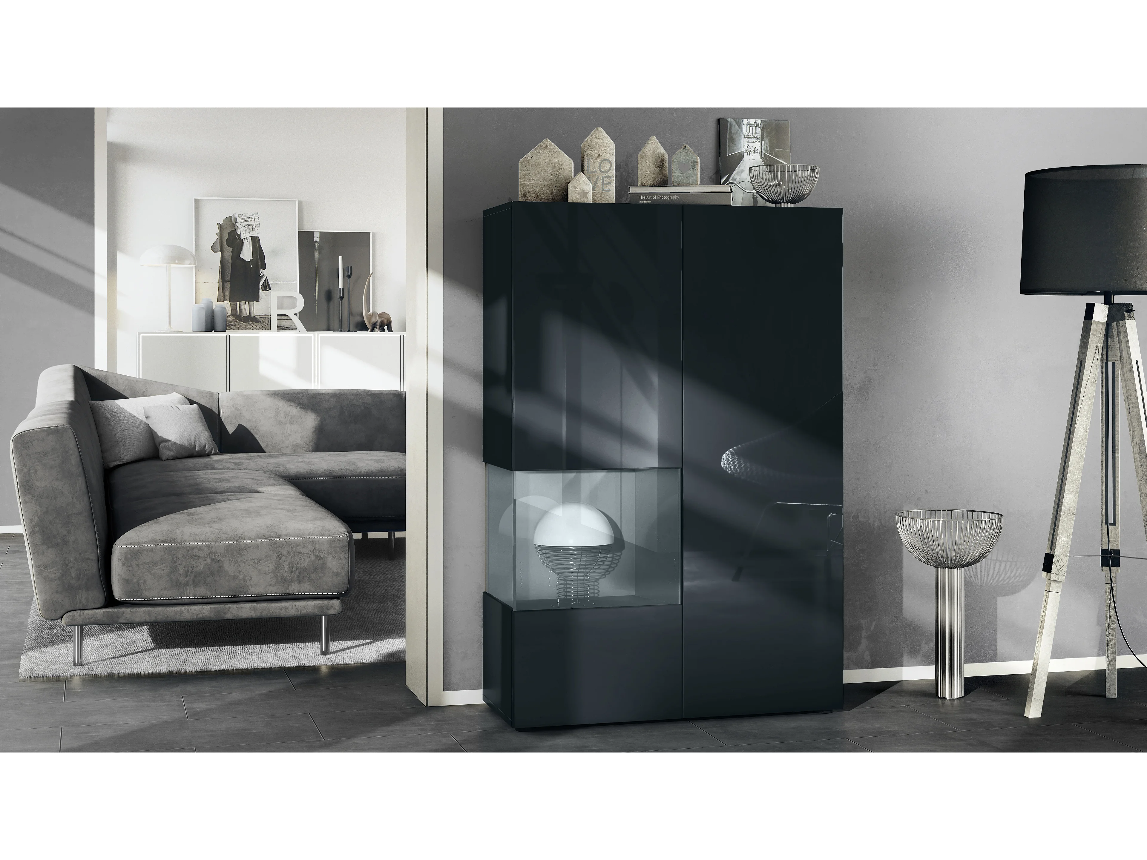 Vitrine Morena V2, vitrine sur pied avec 2 portes et insert en verre, corps noir mat, façades noir haute brillance, Cube gris haute brillance