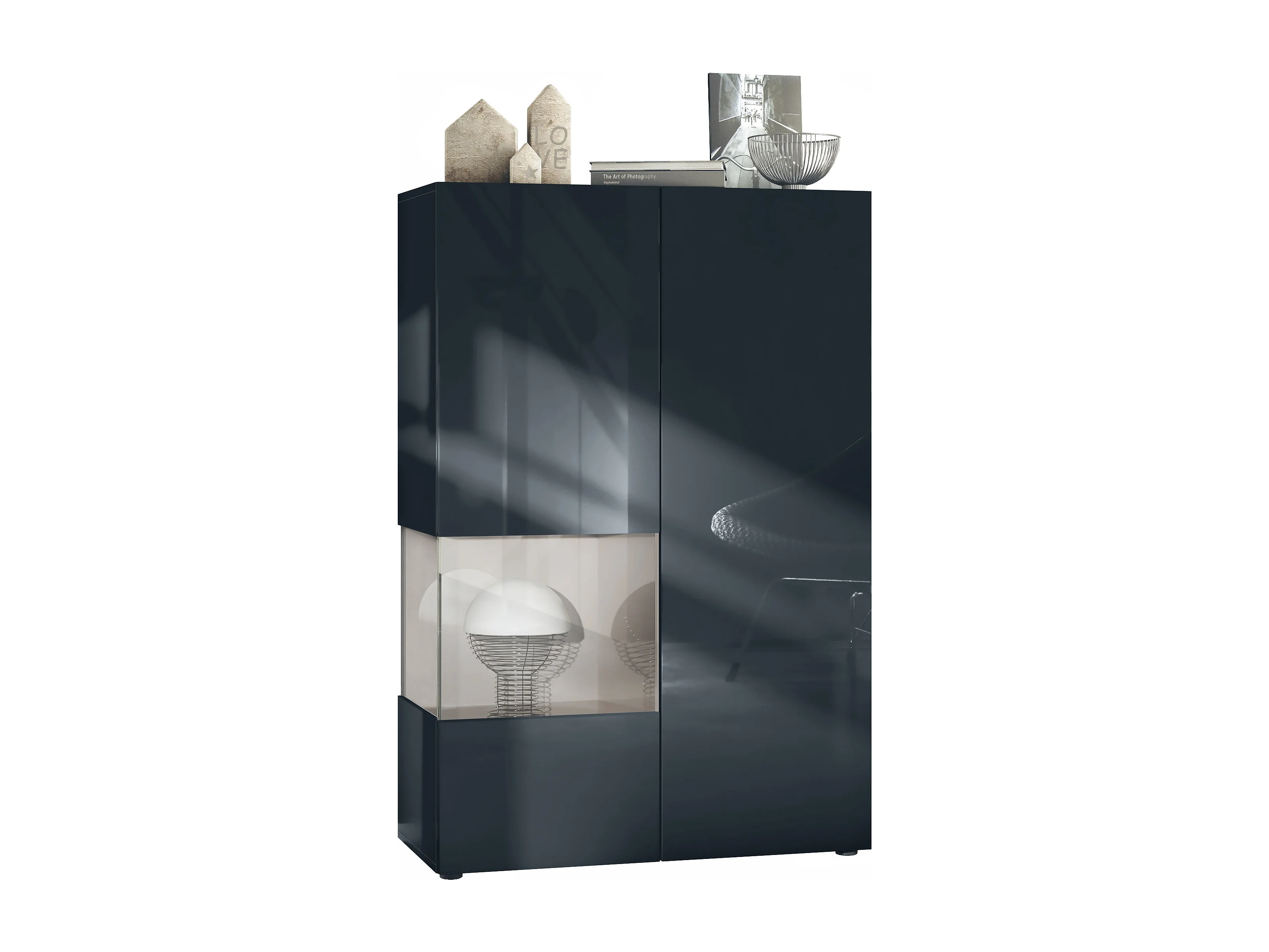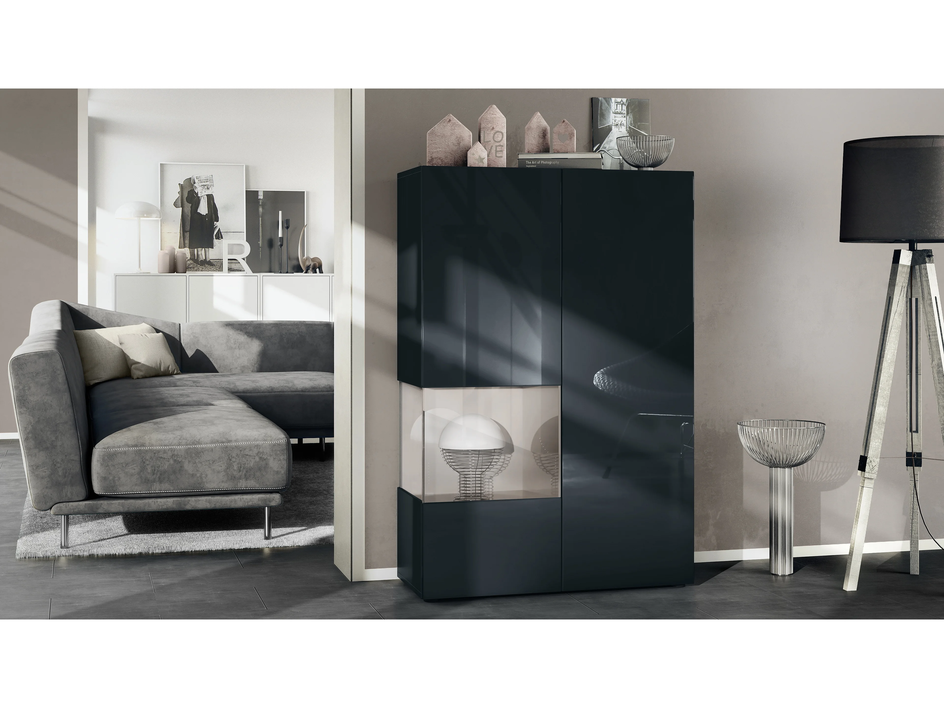 Vitrine Morena V2, vitrine sur pied avec 2 portes et insert en verre, corps noir mat, façades noir haute brillance, Cube gris sable haute brillance