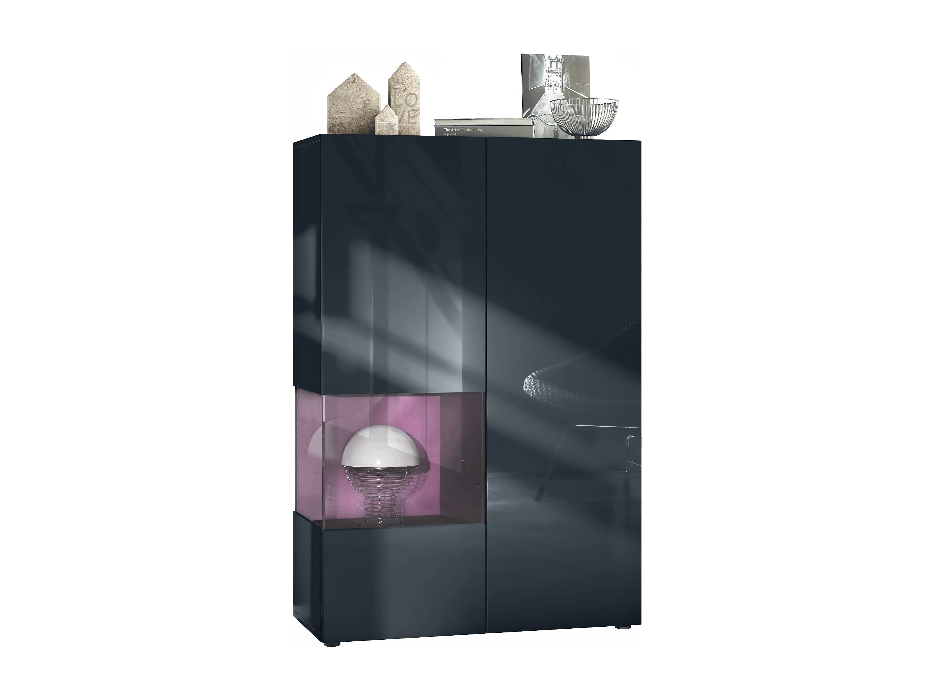 Vitrine Morena V2, vitrine sur pied avec 2 portes et insert en verre, corps noir mat, façades noir haute brillance, Cube mûre haute brillance