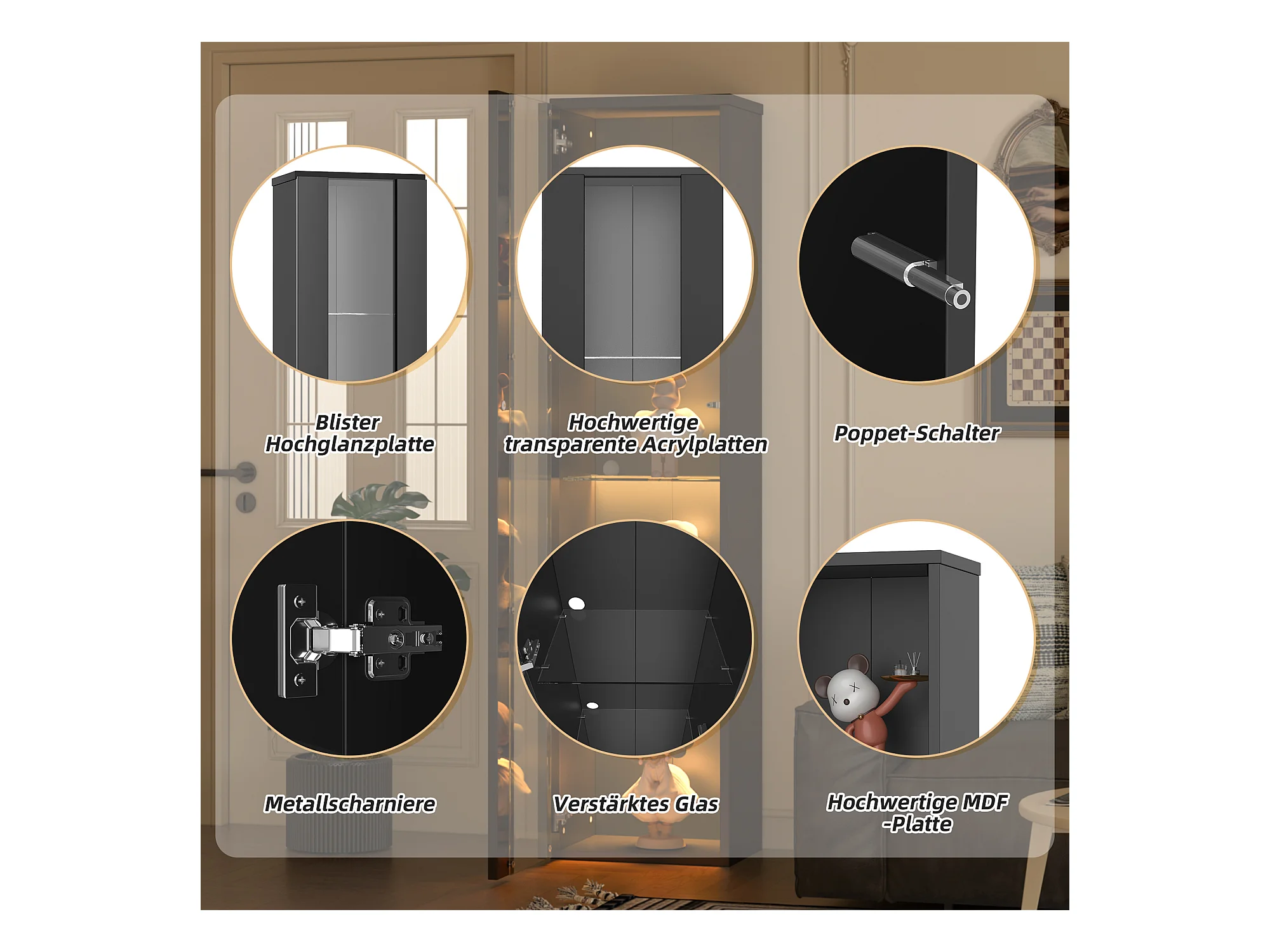 Vitrine haute brillance 55x38x170 cm - 1 tiroir et 4 portes - avec éclairage LED - Noir