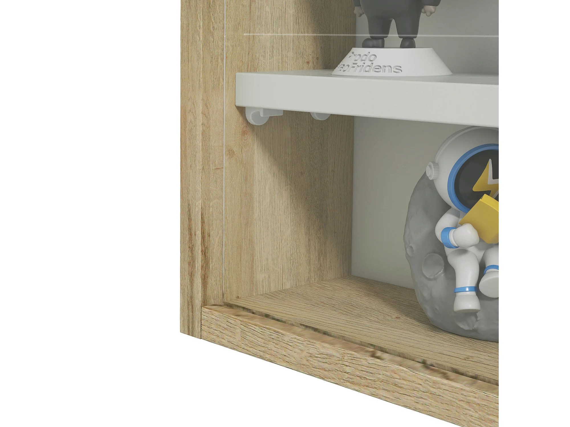 Vitrine sur pied avec 1 porte, 4 étagères en verre réglables en hauteur - Avec éclairage LED - 176x37x33 cm - Couleur hêtre