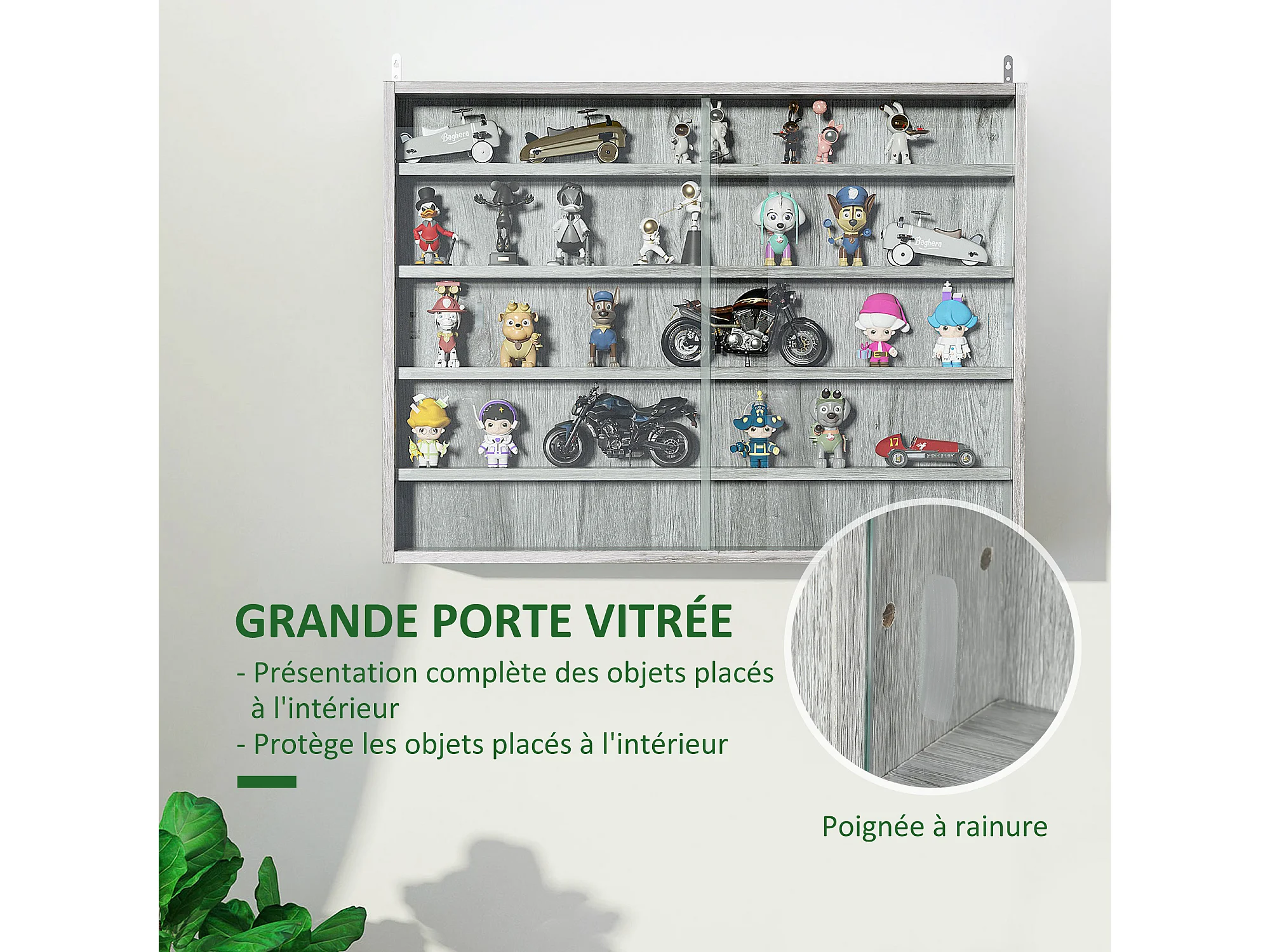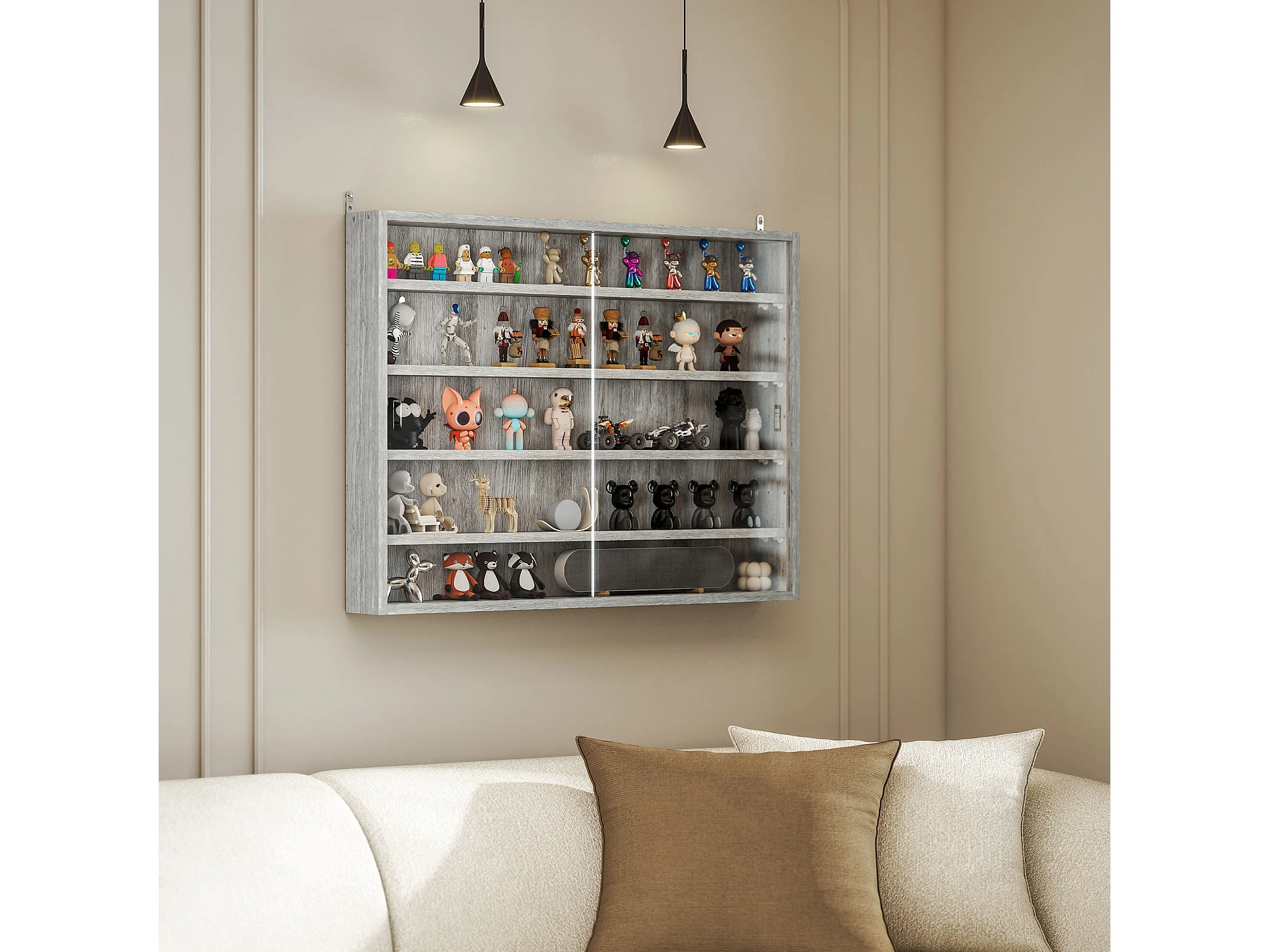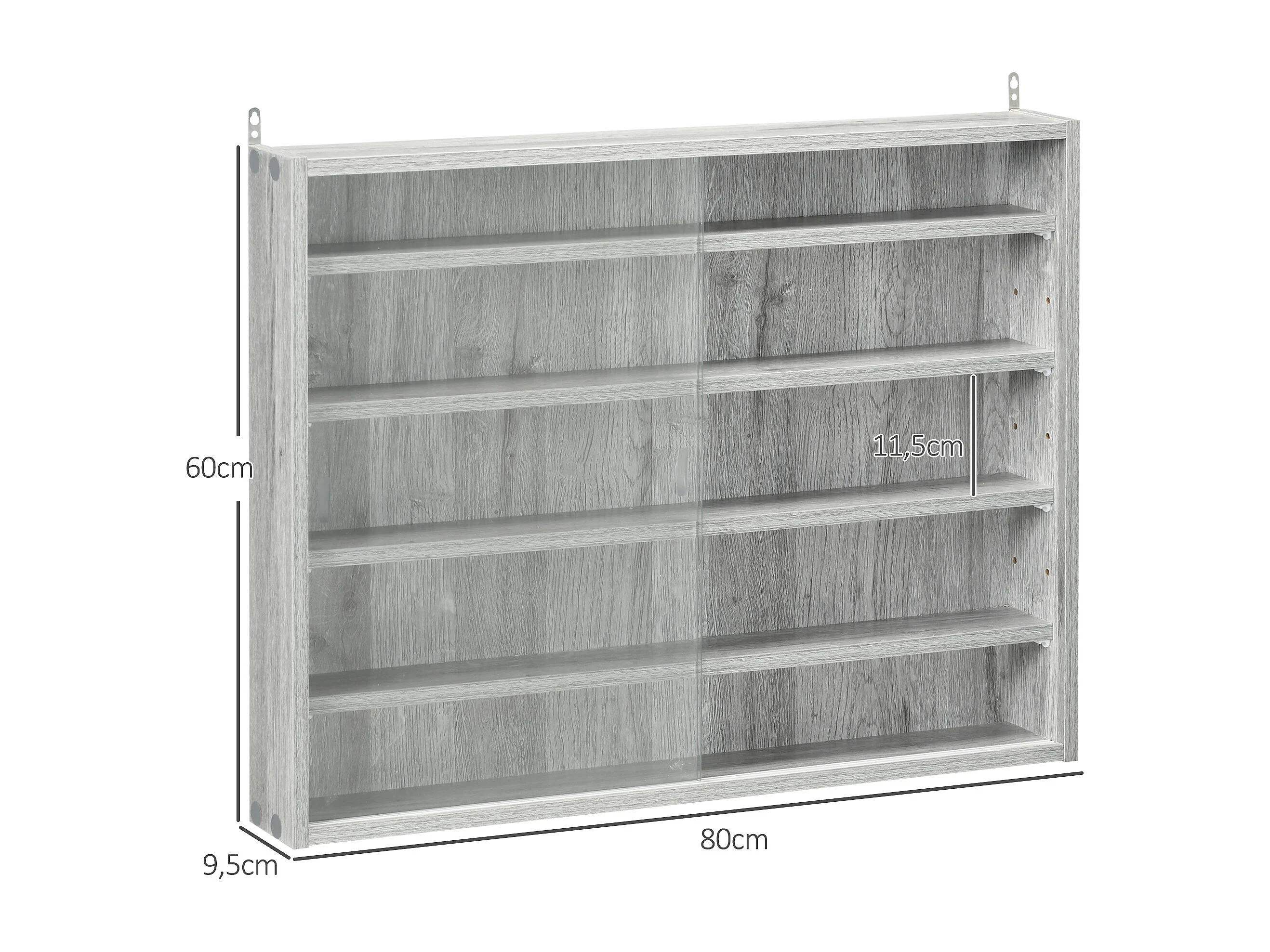 Vitrine murale étagère - 5 étagères réglables - 2 portes coulissantes verre - panneaux gris