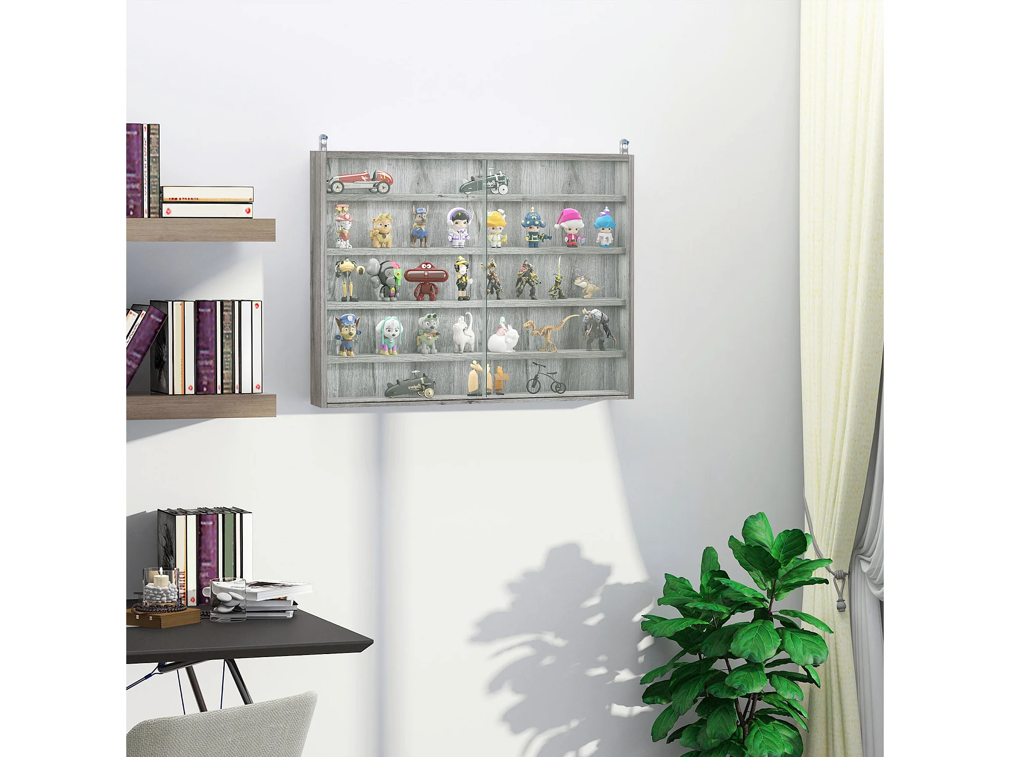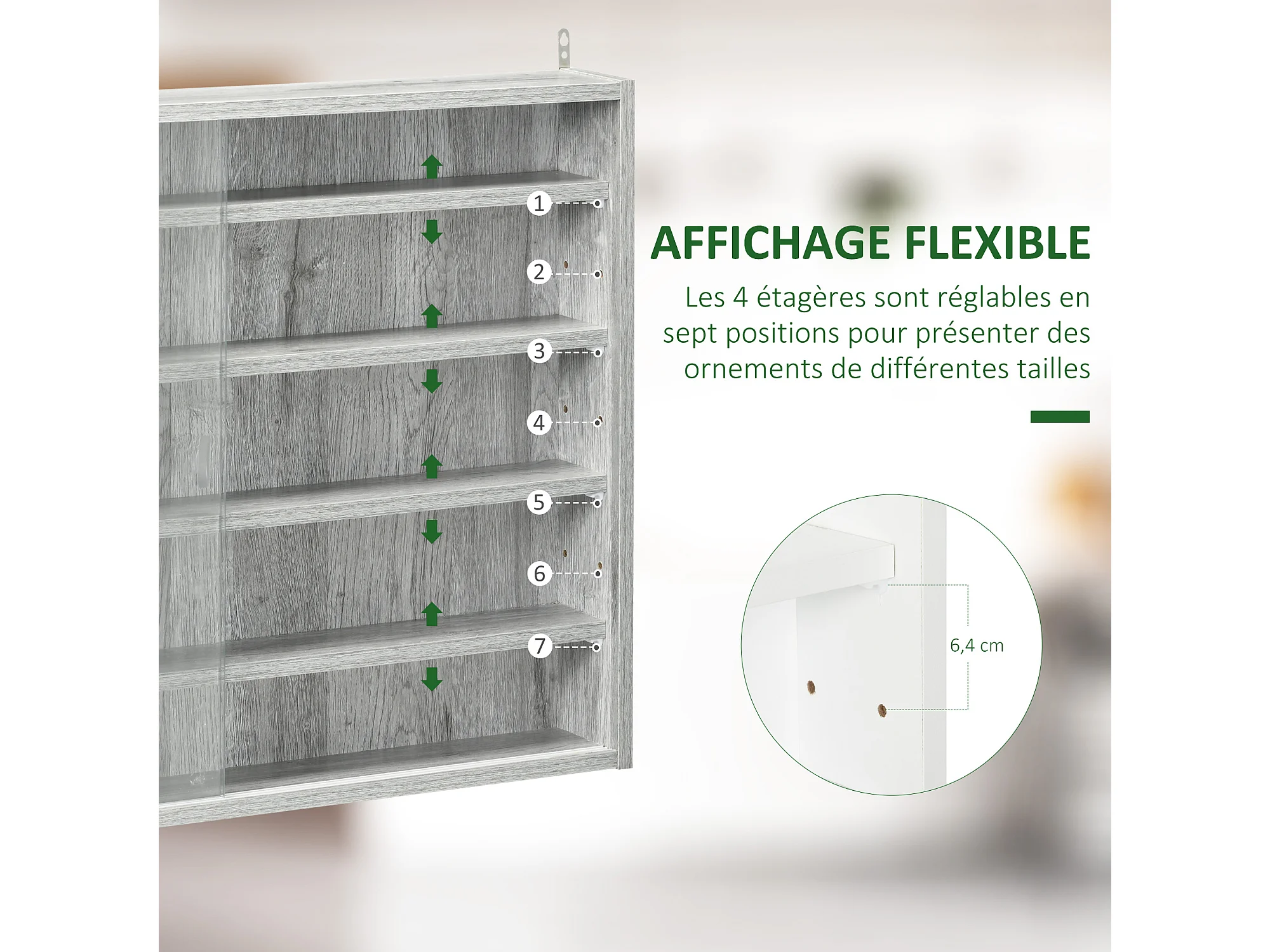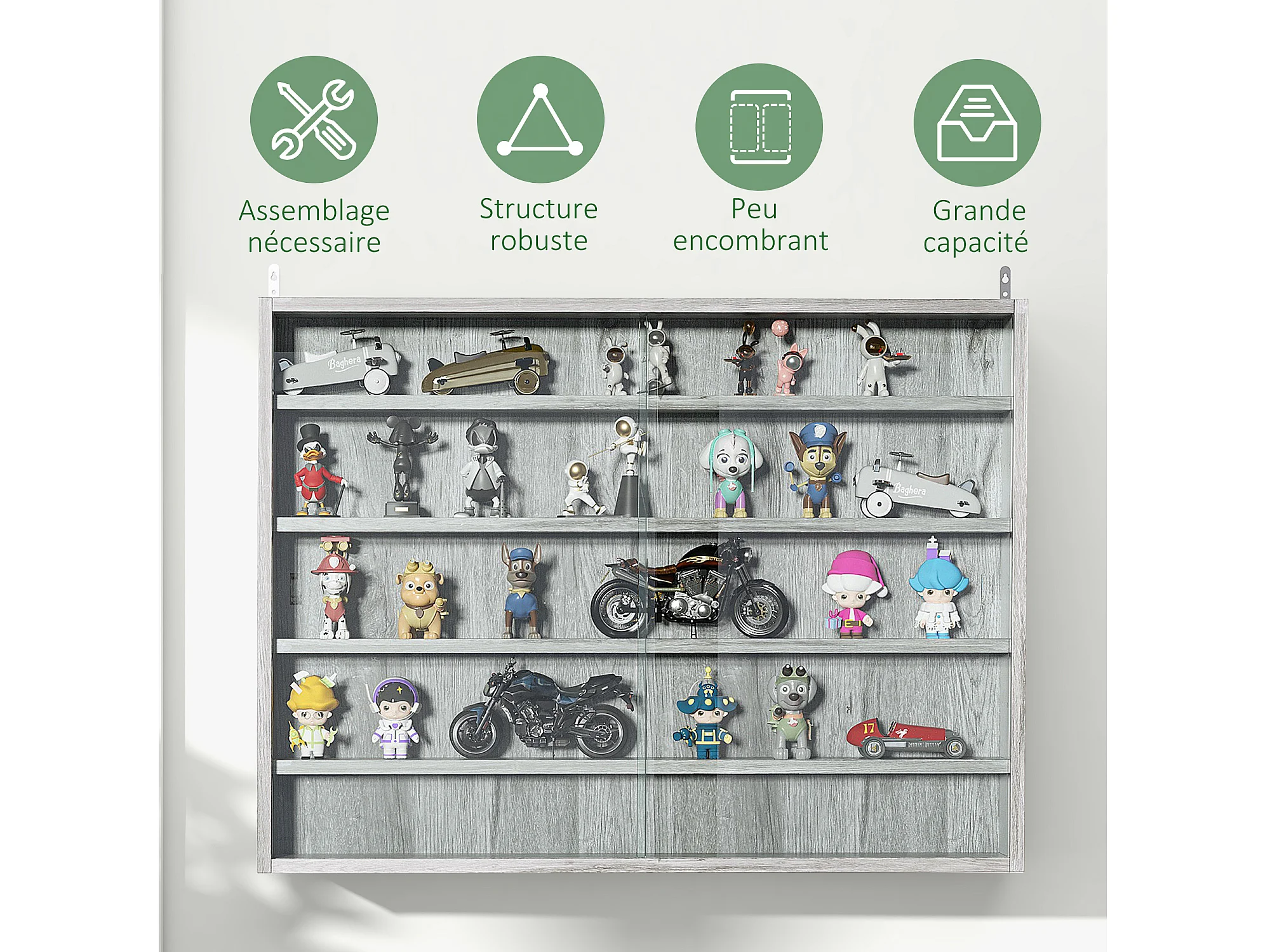 Vitrine murale étagère - 5 étagères réglables - 2 portes coulissantes verre - panneaux gris