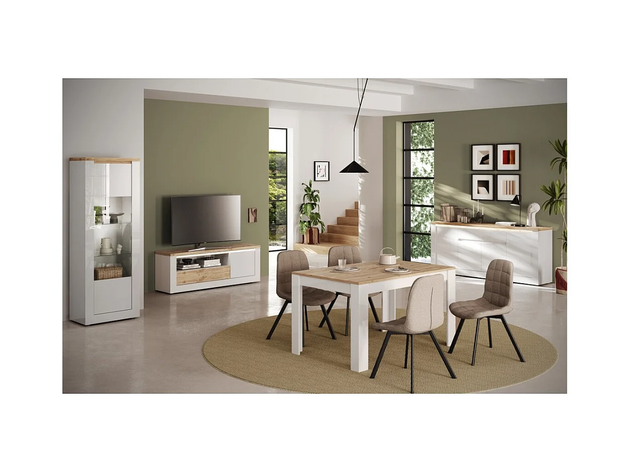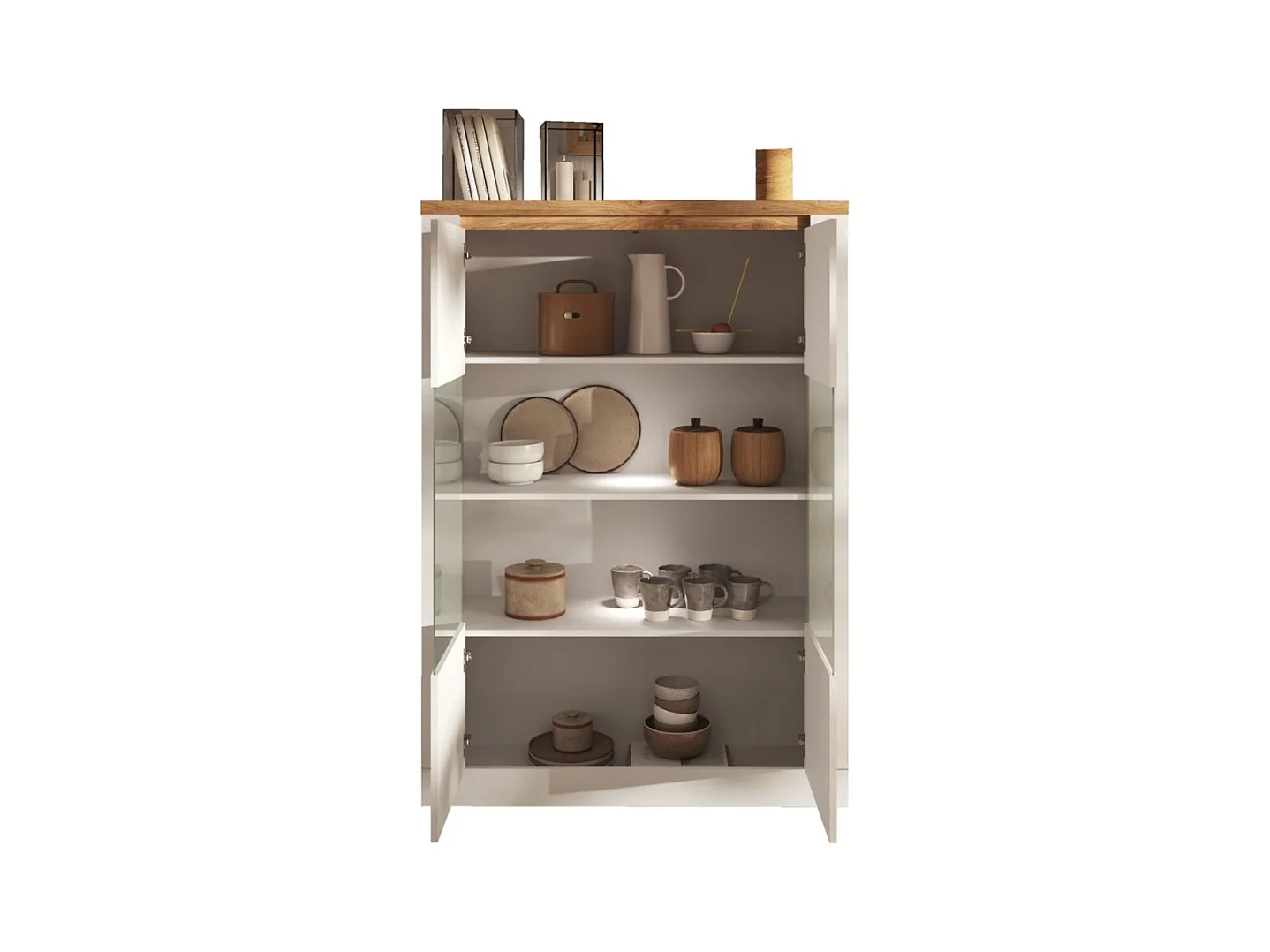 Vitrine SASHA – 2 portes vitrées +3 étagères avec LED intégrée – Blanc laqué et Chêne Cadiz