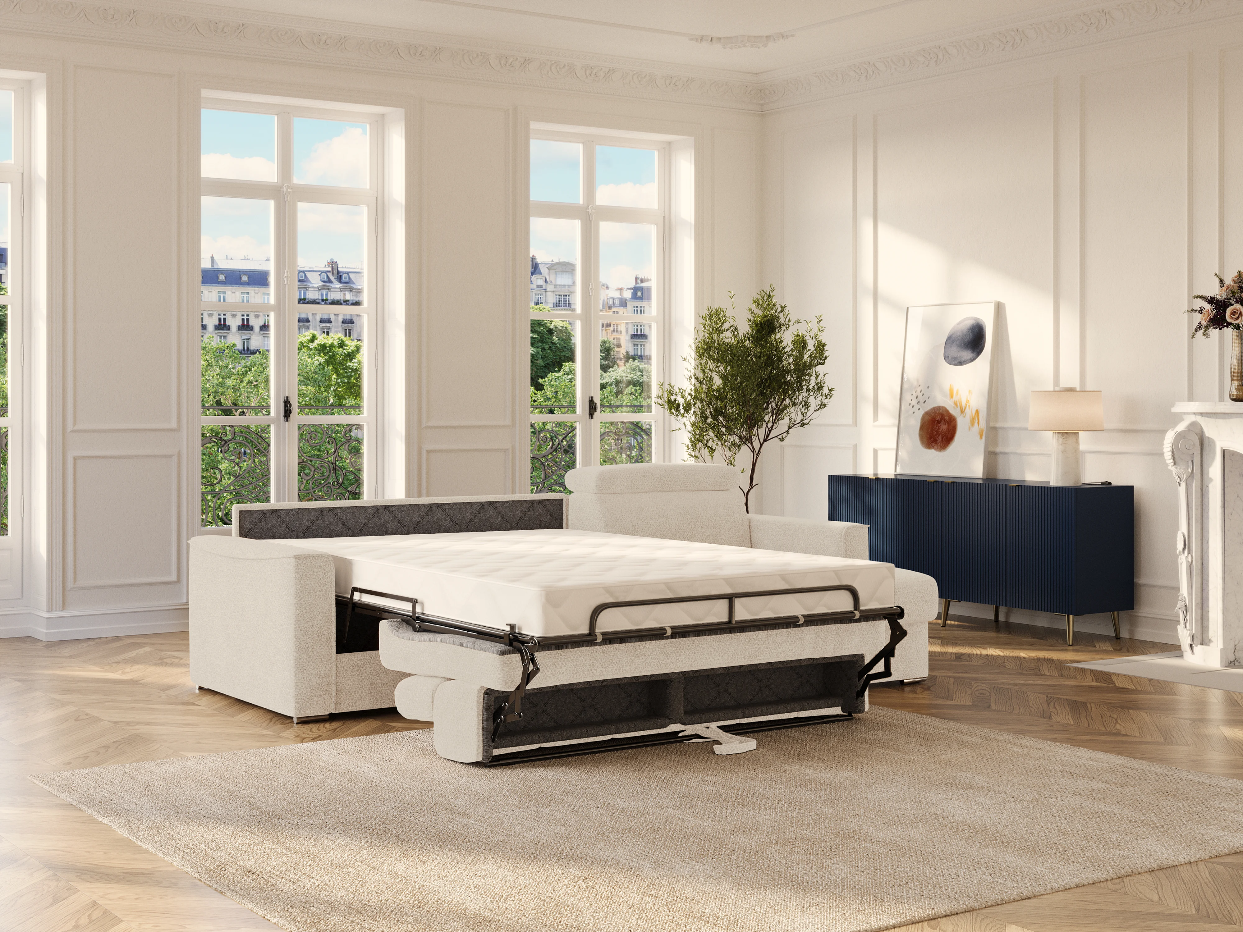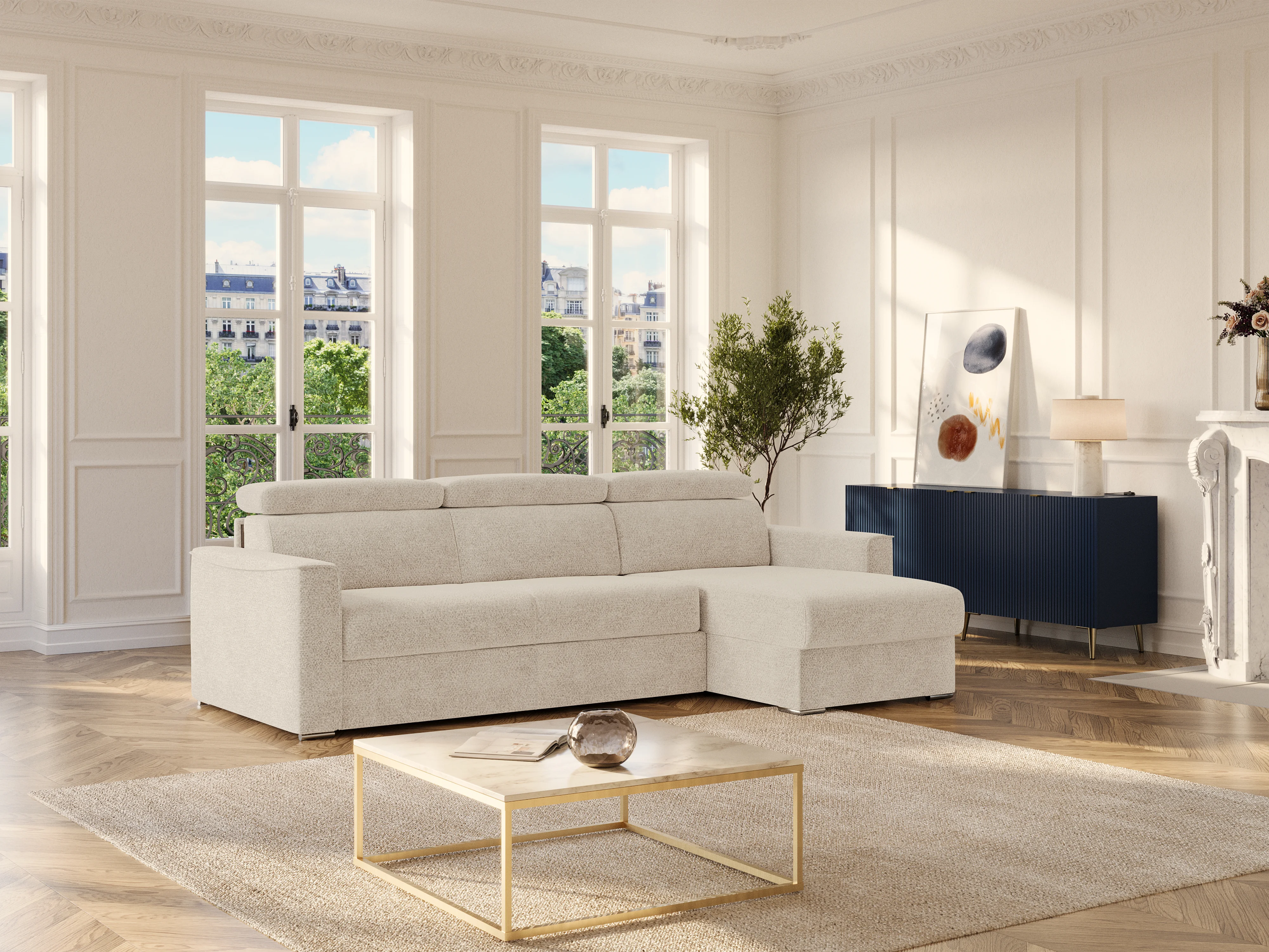 Canapé d'angle réversible convertible express en tissu chenille beige - Couchage 160 cm - Matelas 22 cm mémoire de forme VIZIR
