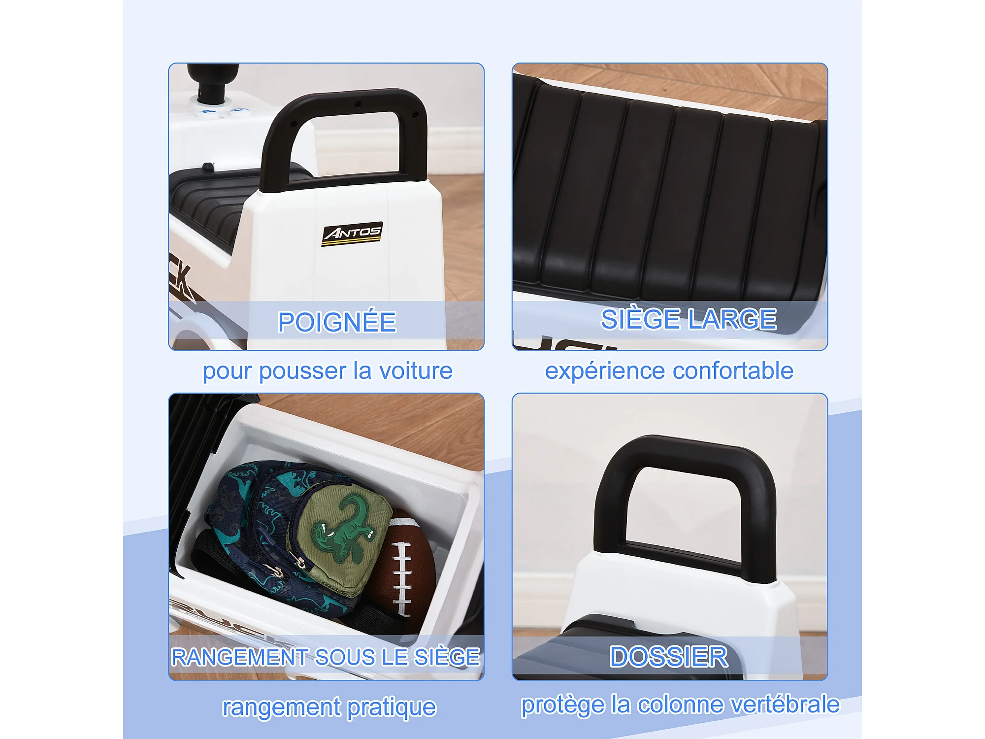 Porteur enfant voiture 18-36 mois klaxon bruit moteur coffre butée arrière anti-basculement blanc