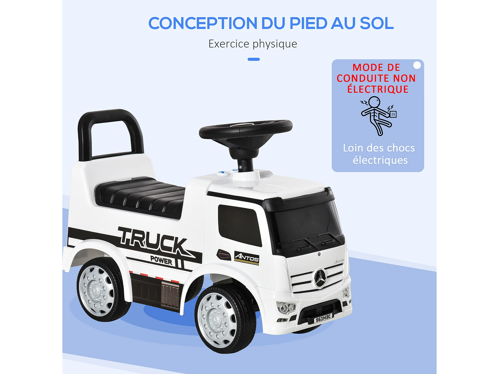 Voiture porteur enfant camion licence Mercedes-Benz Antos 12-36 mois coffre effets lumineux sonores blanc