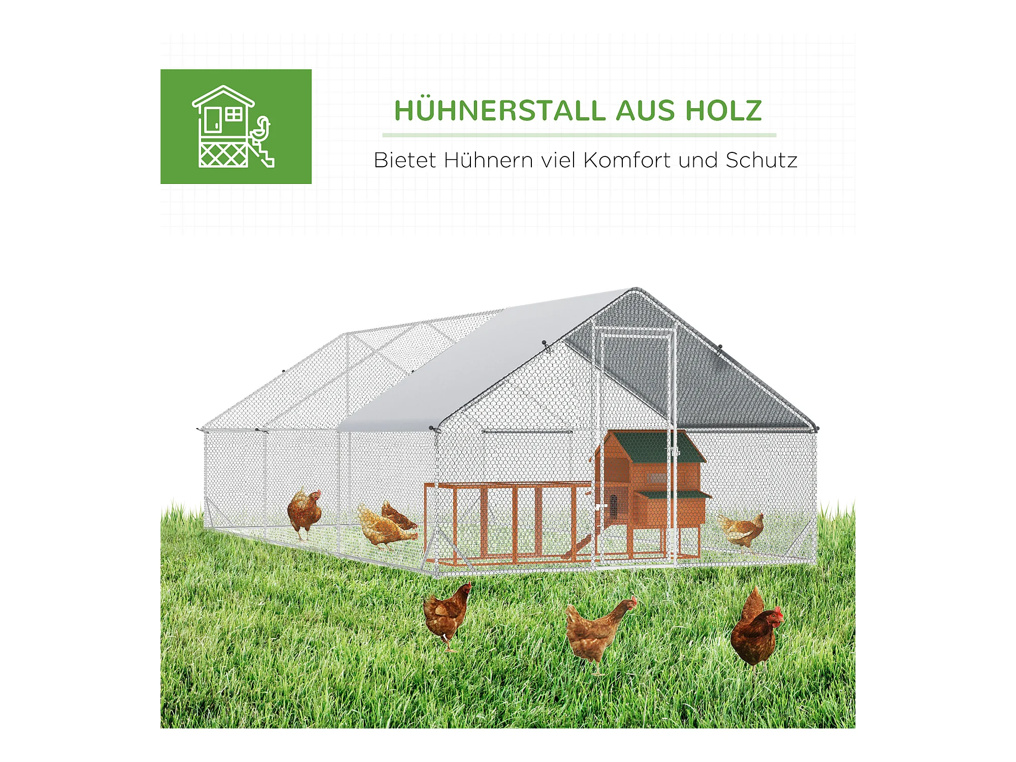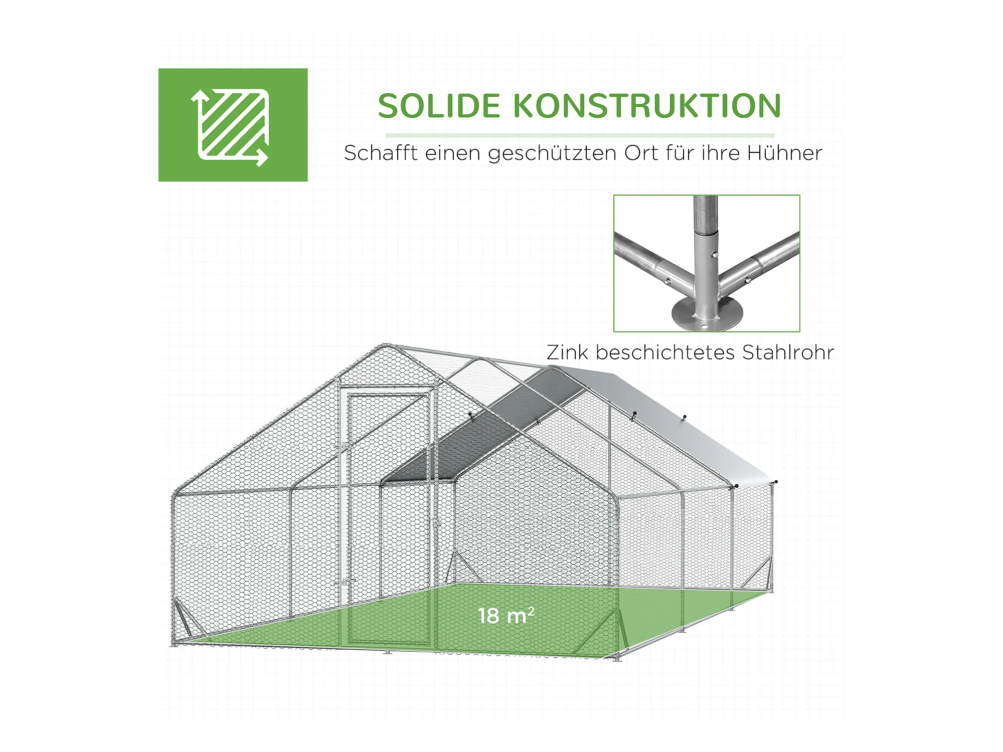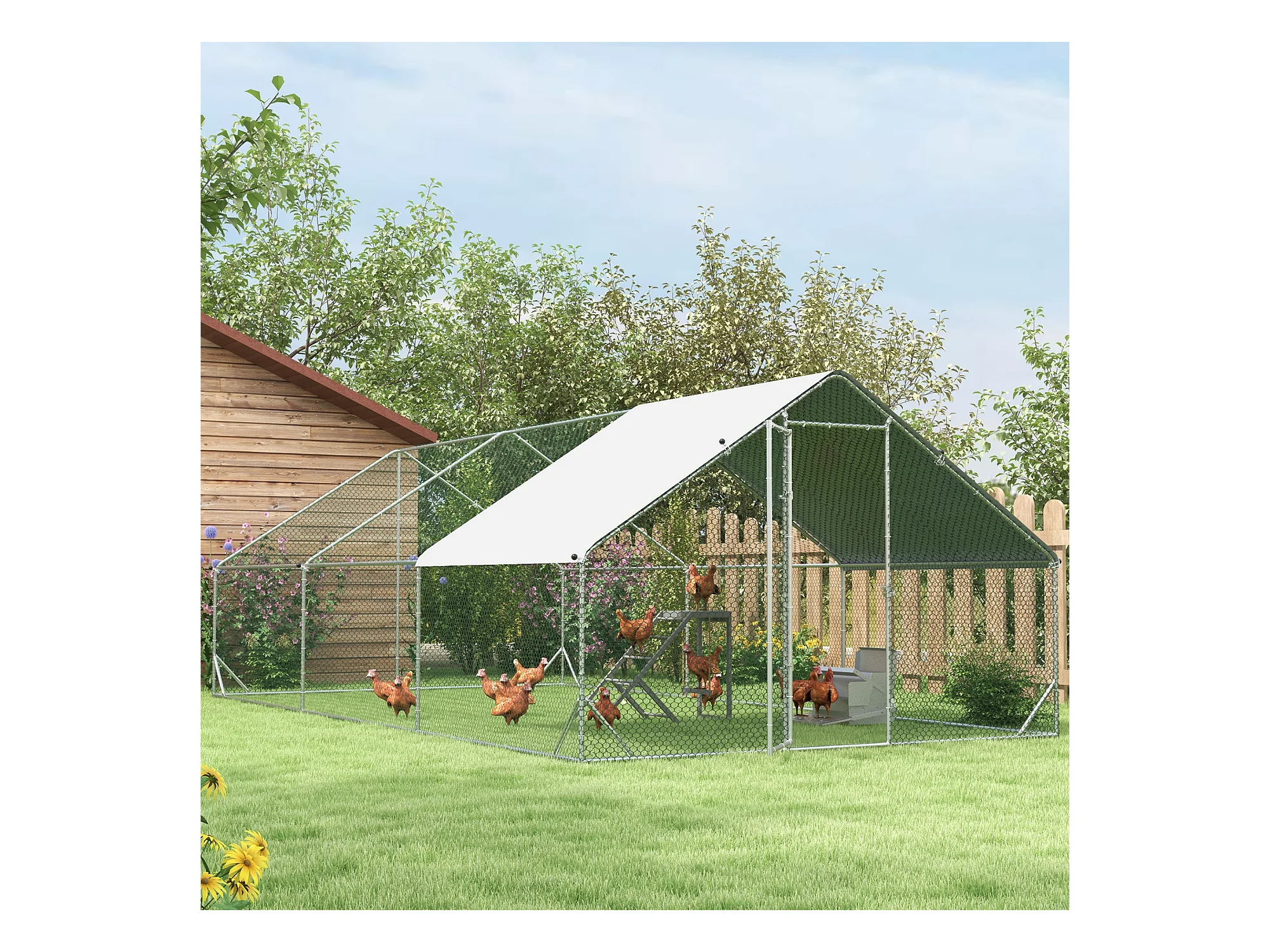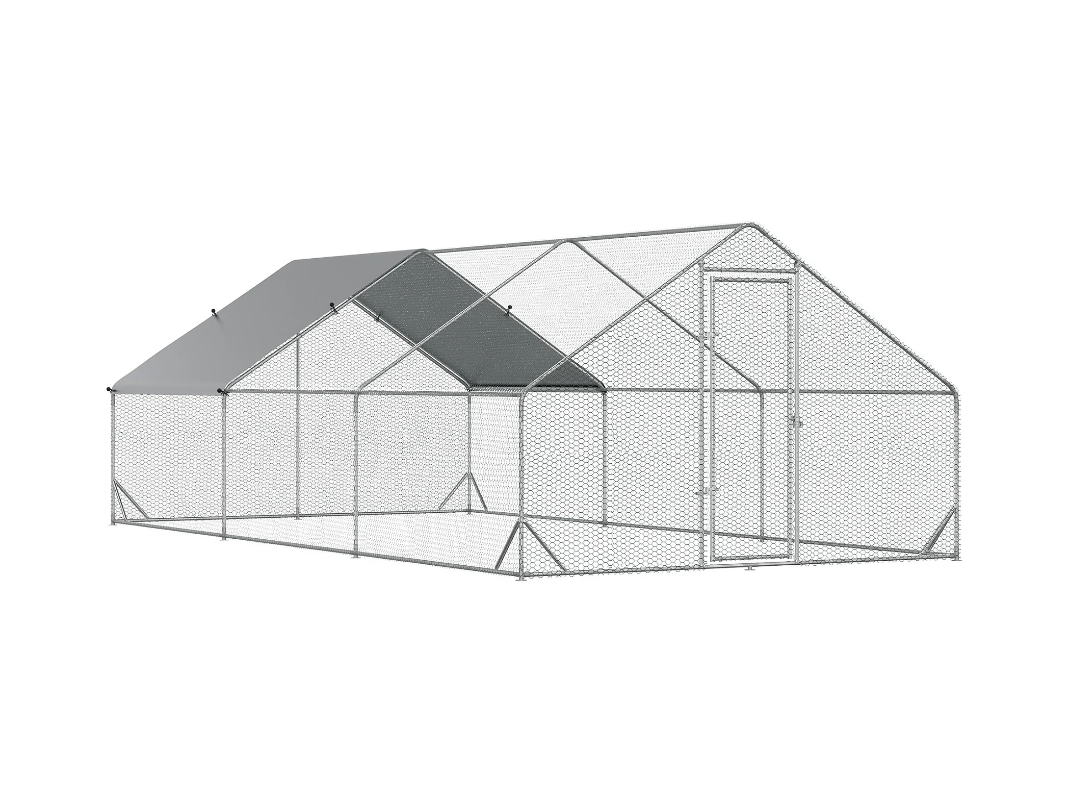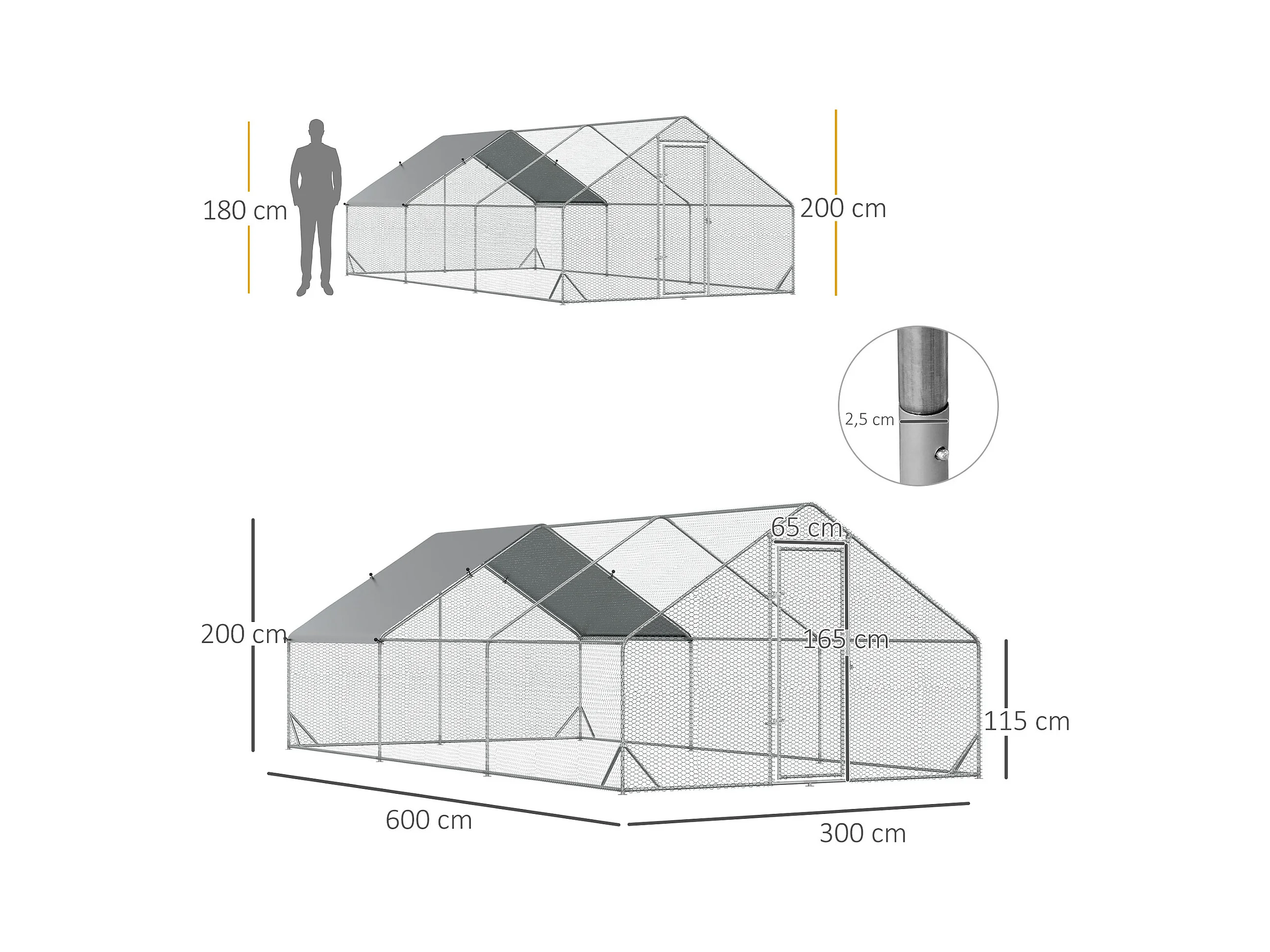 Volière extérieure spacieuse pour poules, canards et lapins, acier galvanisé, argenté, avec toit et zone ombragée (300x600x200 cm)
