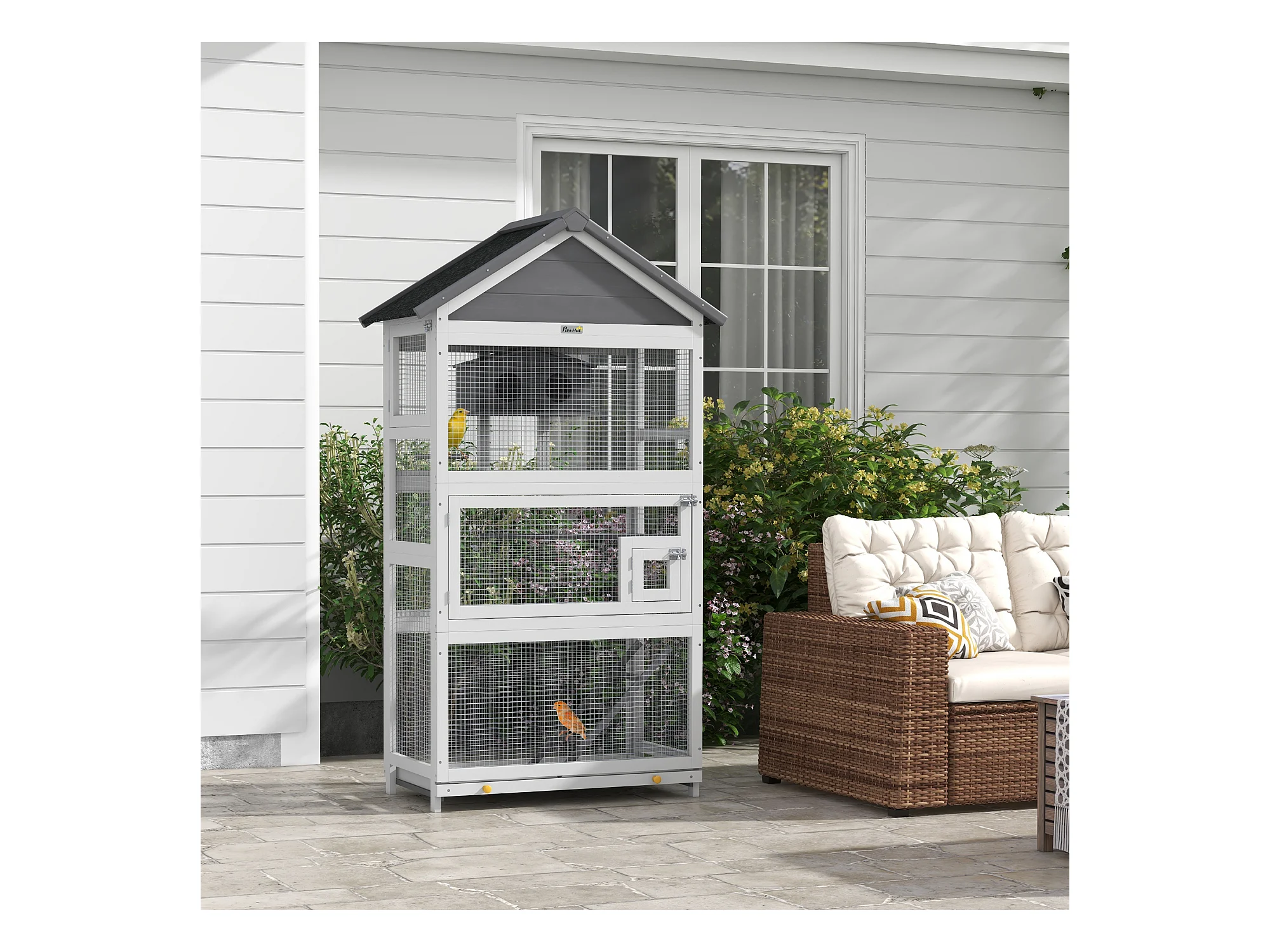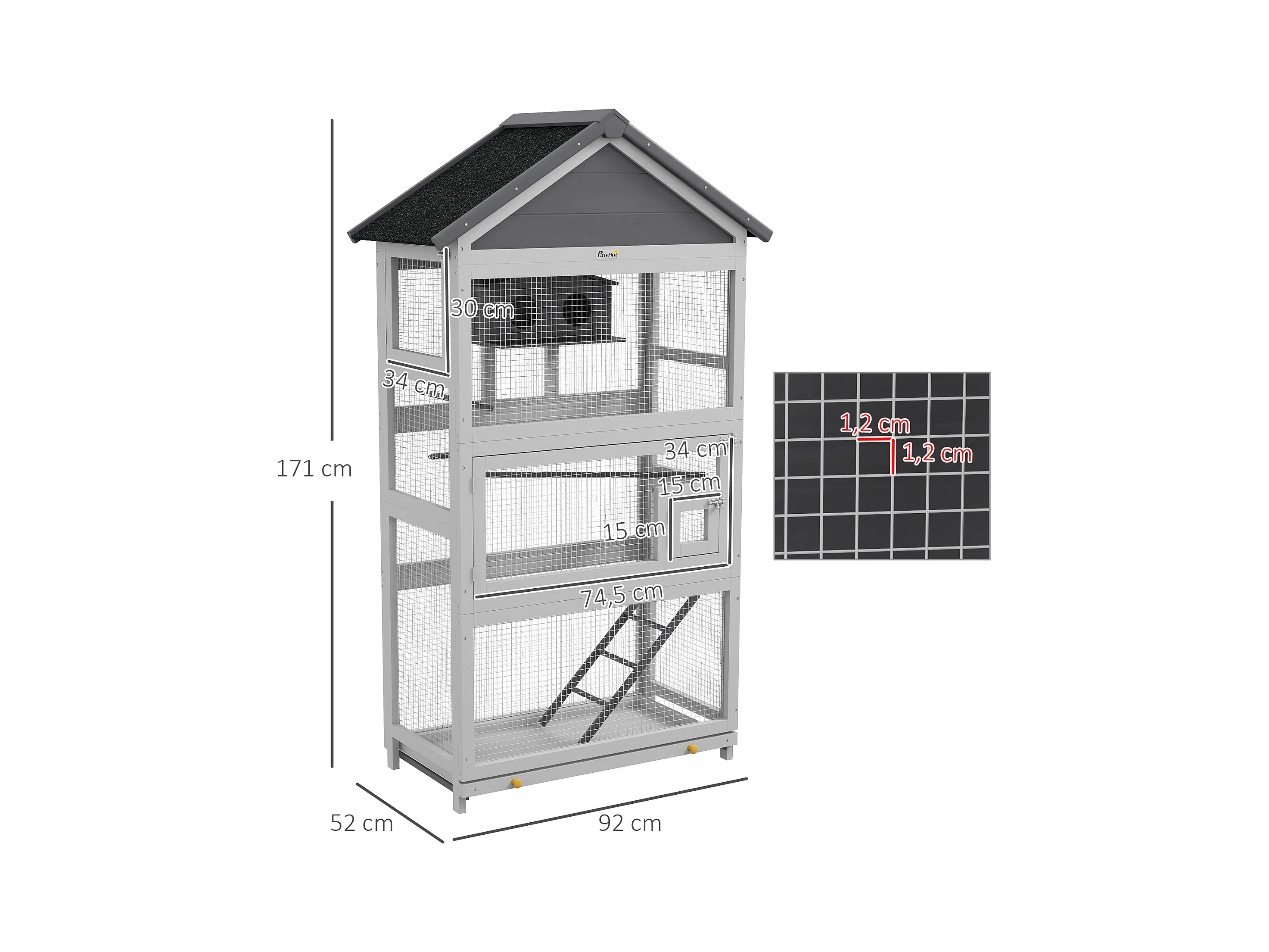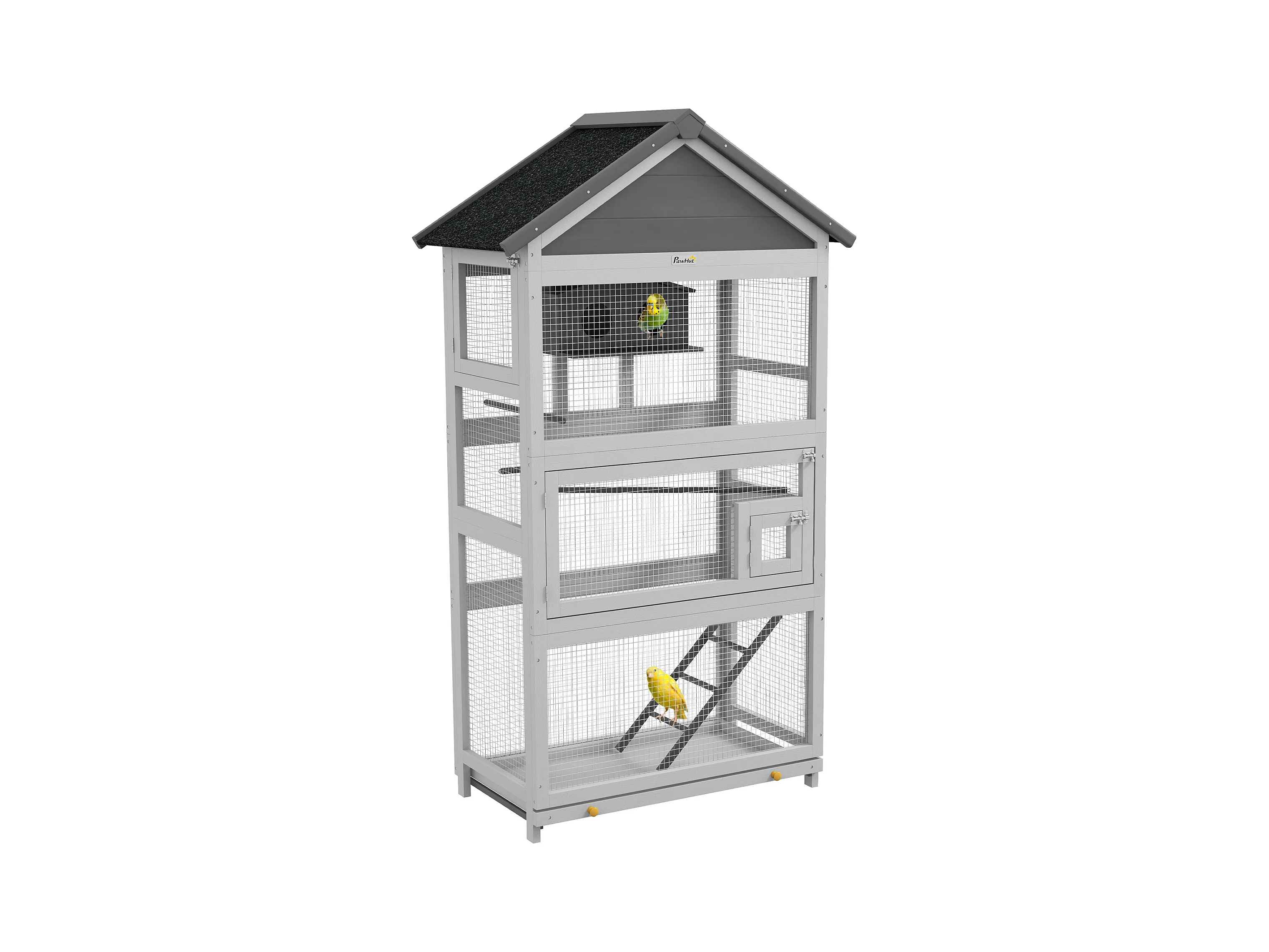 Volière grande cage à oiseaux en bois - 3 portes, toit bitumé double pente, échelle, perchoirs, nichoir, plateau - gris