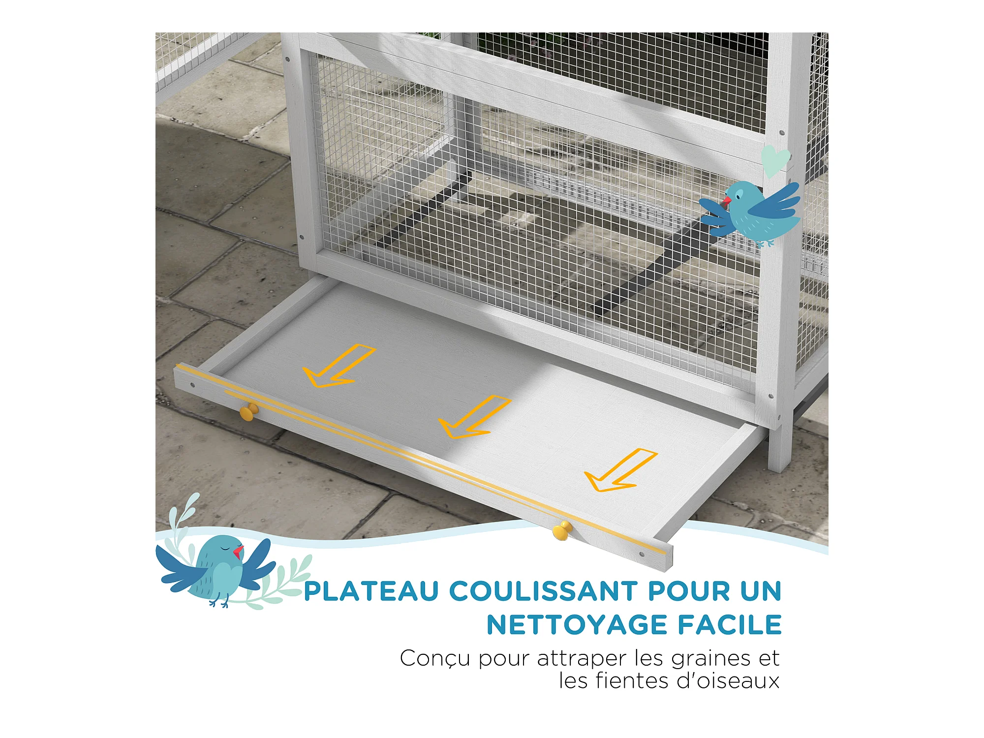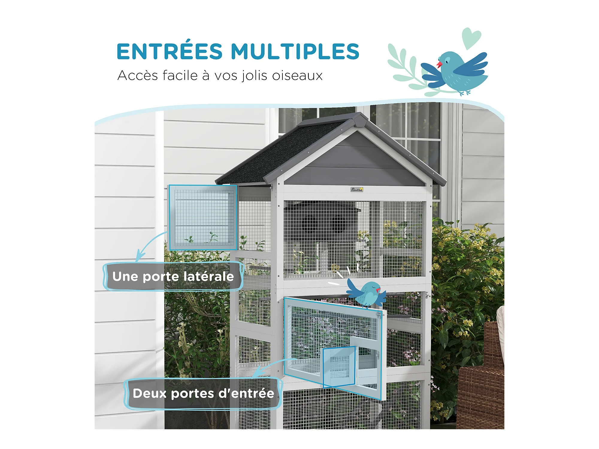 Cage à oiseaux volière grande taille 2 portes toit asphalte tiroir amovible bois gris