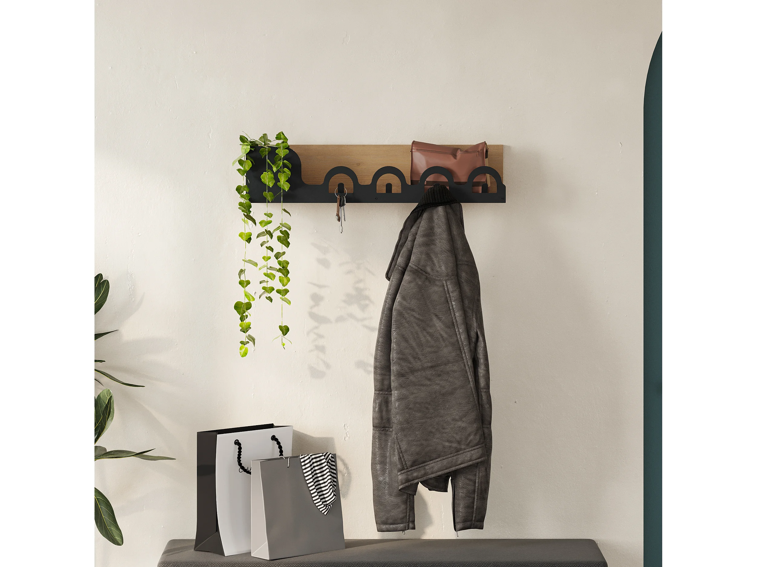 Decortie Chêne 14x63x14cm Porte-manteau mural avec 5 crochets, Panneau de particules, Métal Rangement d'étagère Liora