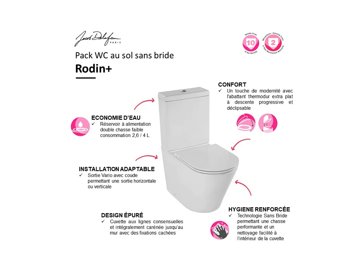 WC au sol sans bride JACOB DELAFON Rodin+ sortie vario avec abattant avec nettoyant