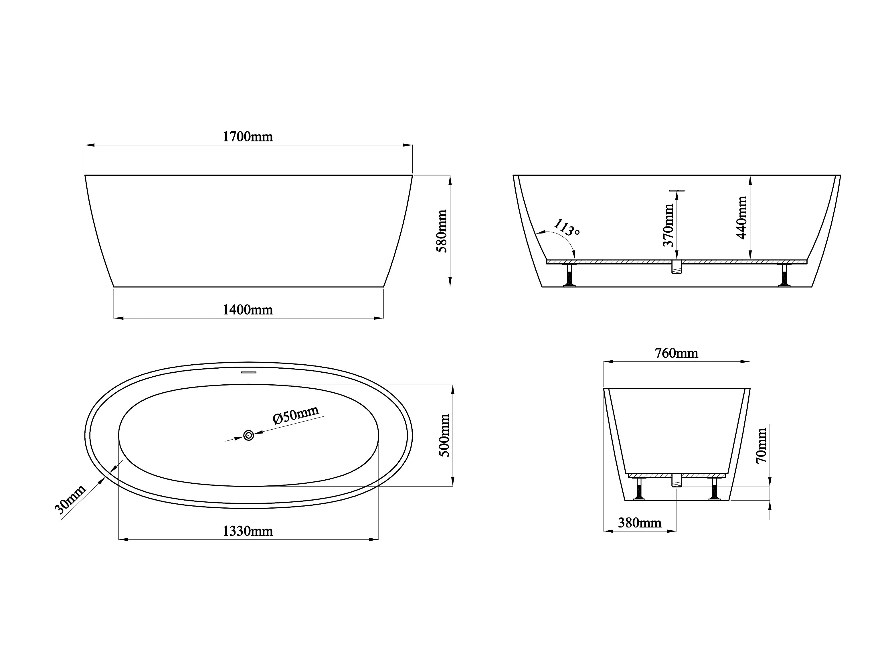 Baignoire îlot blanche - 250 L - Acrylique - 170 x 76 x 58 cm - YAMISA