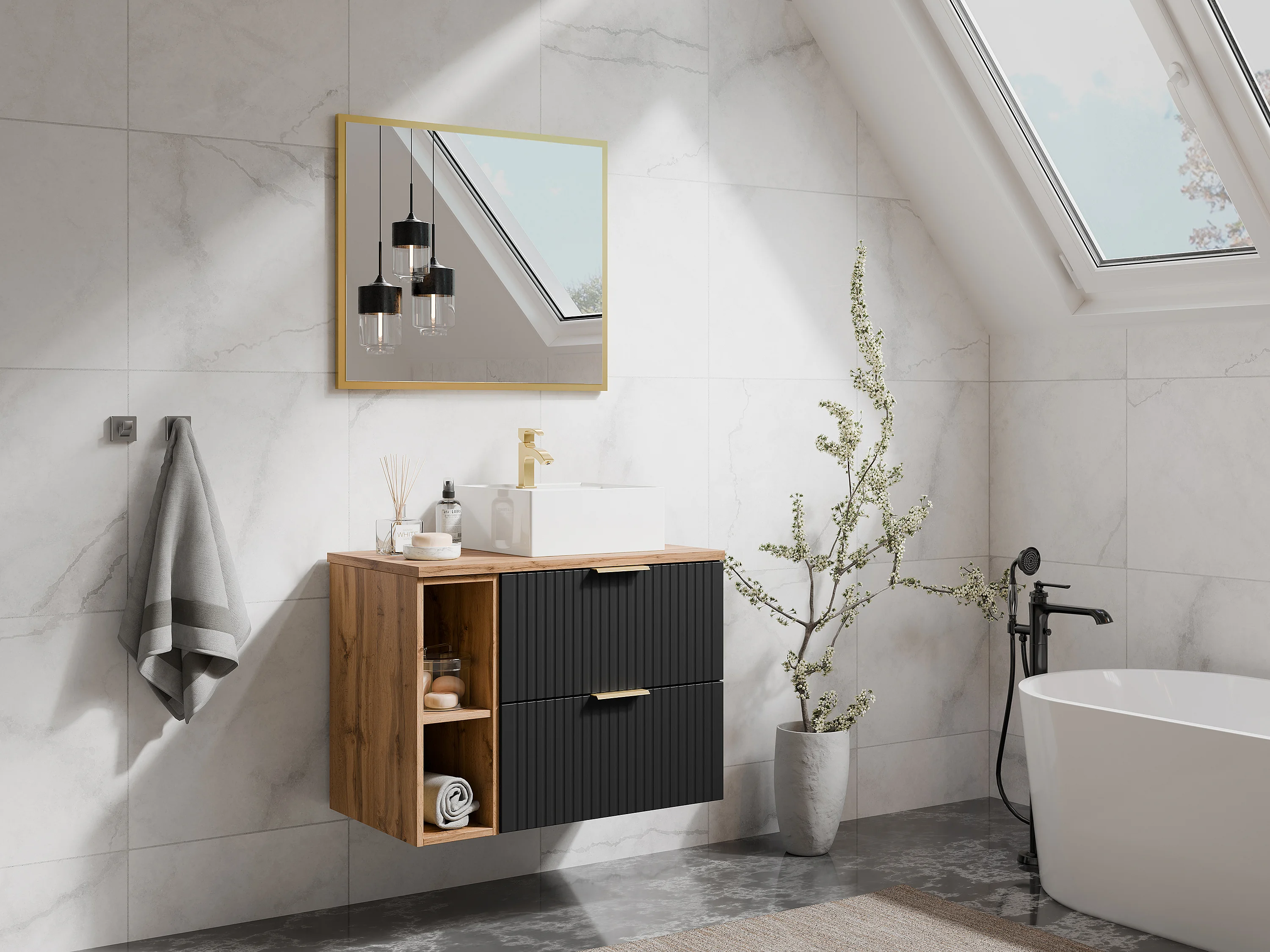 Meuble de salle de bain suspendu strié avec niches et vasque à poser carrée - Noir et naturel clair - L80 cm - ZEVARA